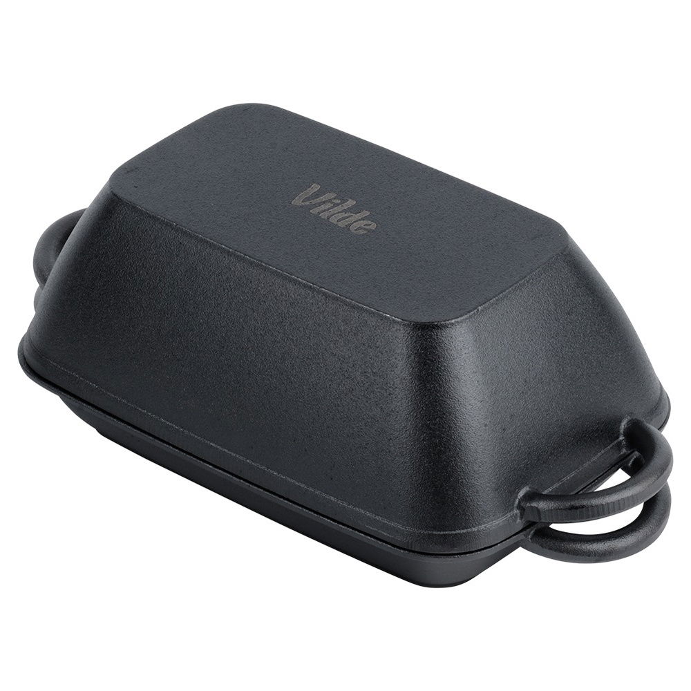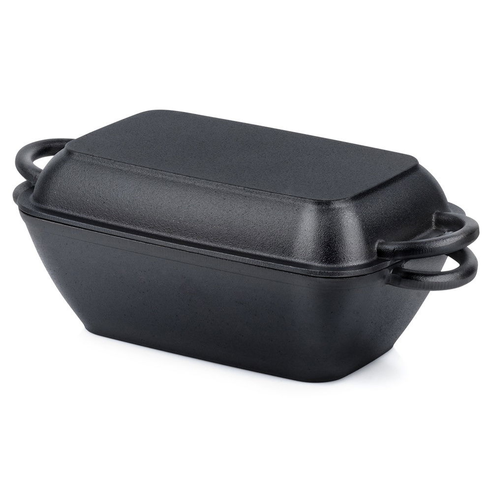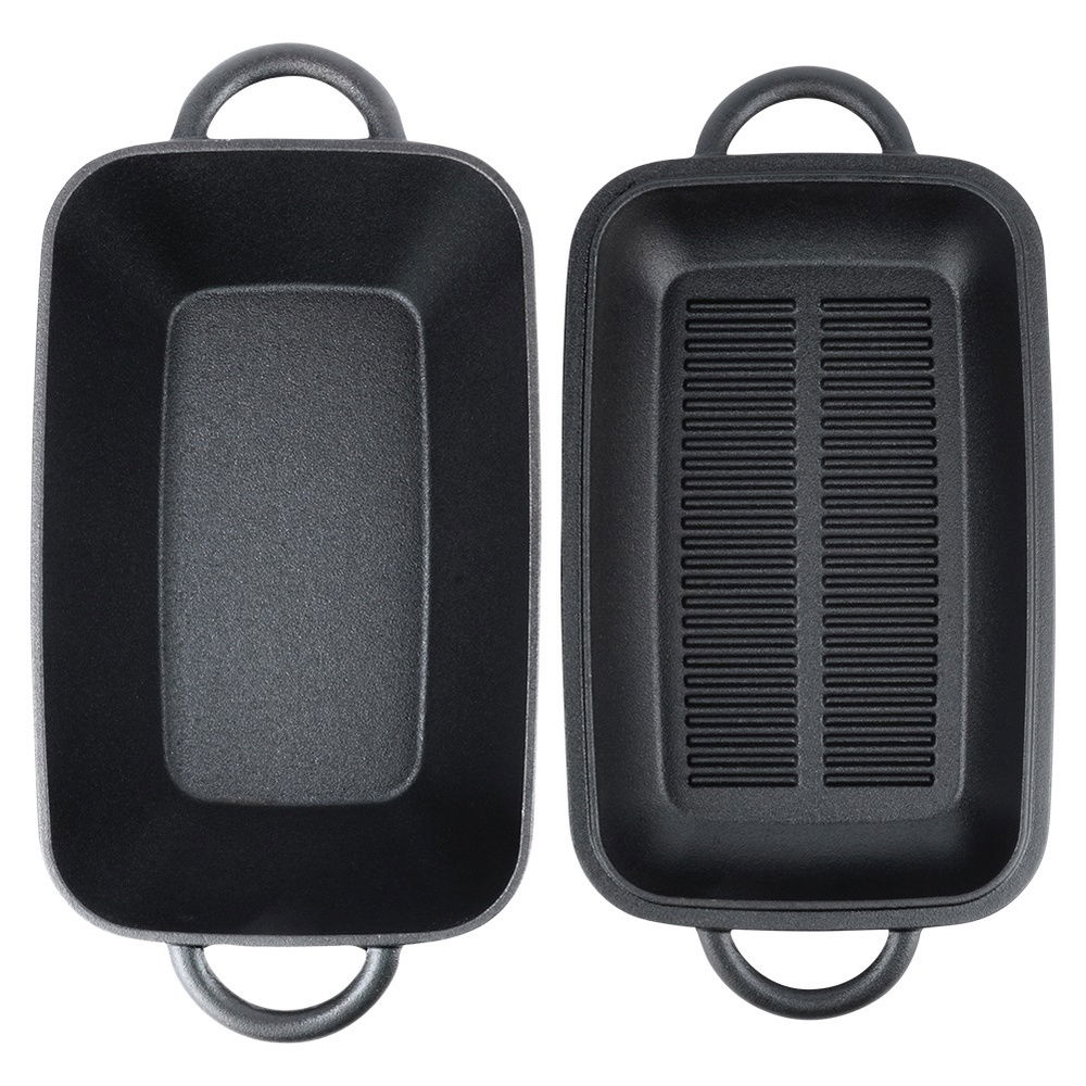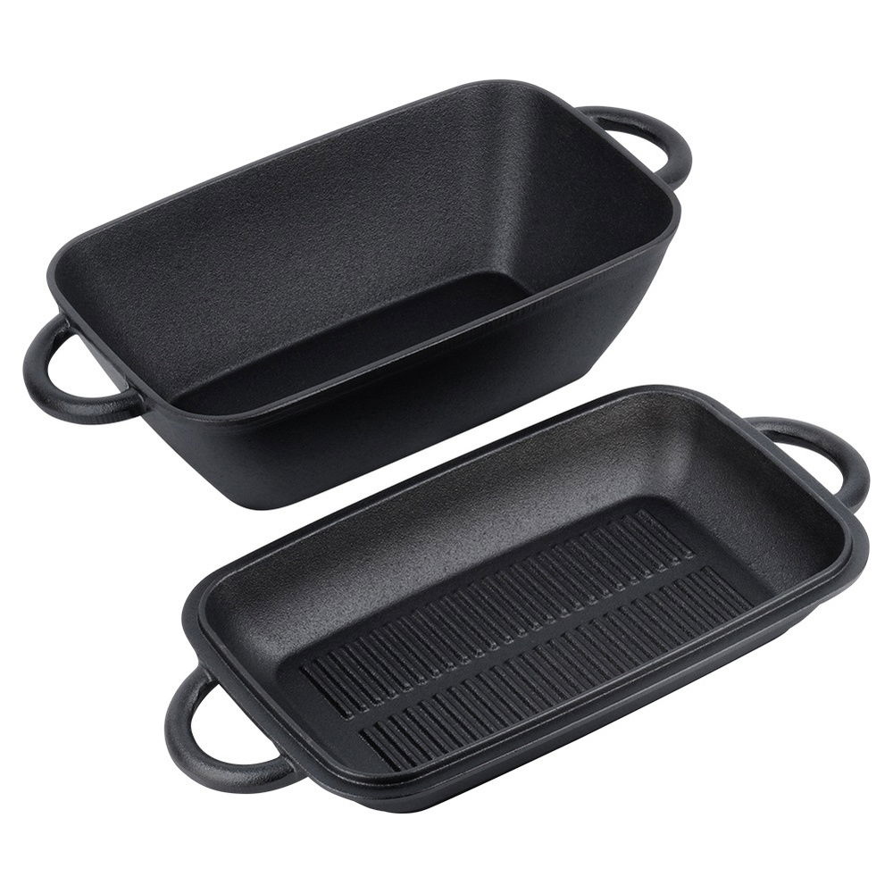 Brytfanna żeliwna 2w1 - Brytfanna z pokrywką, która stanowi również osobne naczynie do zapiekania. Brytfanna doskonale nadaje się do pieczenia, duszenia i zapiekania mięs, warzyw, ziemniaków. Po zdjęciu pokrywki uzyskujemy dwa oddzielne naczynia. Wymiary zewnętrzne brytfanny bez pokrywki: 37,5 x 19 x 9,5 cm, wysokość z pokrywką wynosi 14 cm, a pojemność 3,5 l. Pokrywka z powłoką grillową ma wymiary 37,5 x 19,5 x 5 cm i pojemność 1,5 l.