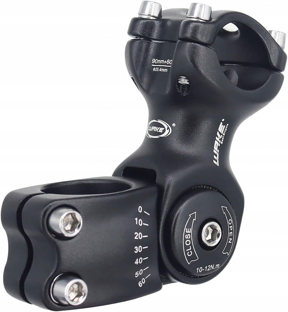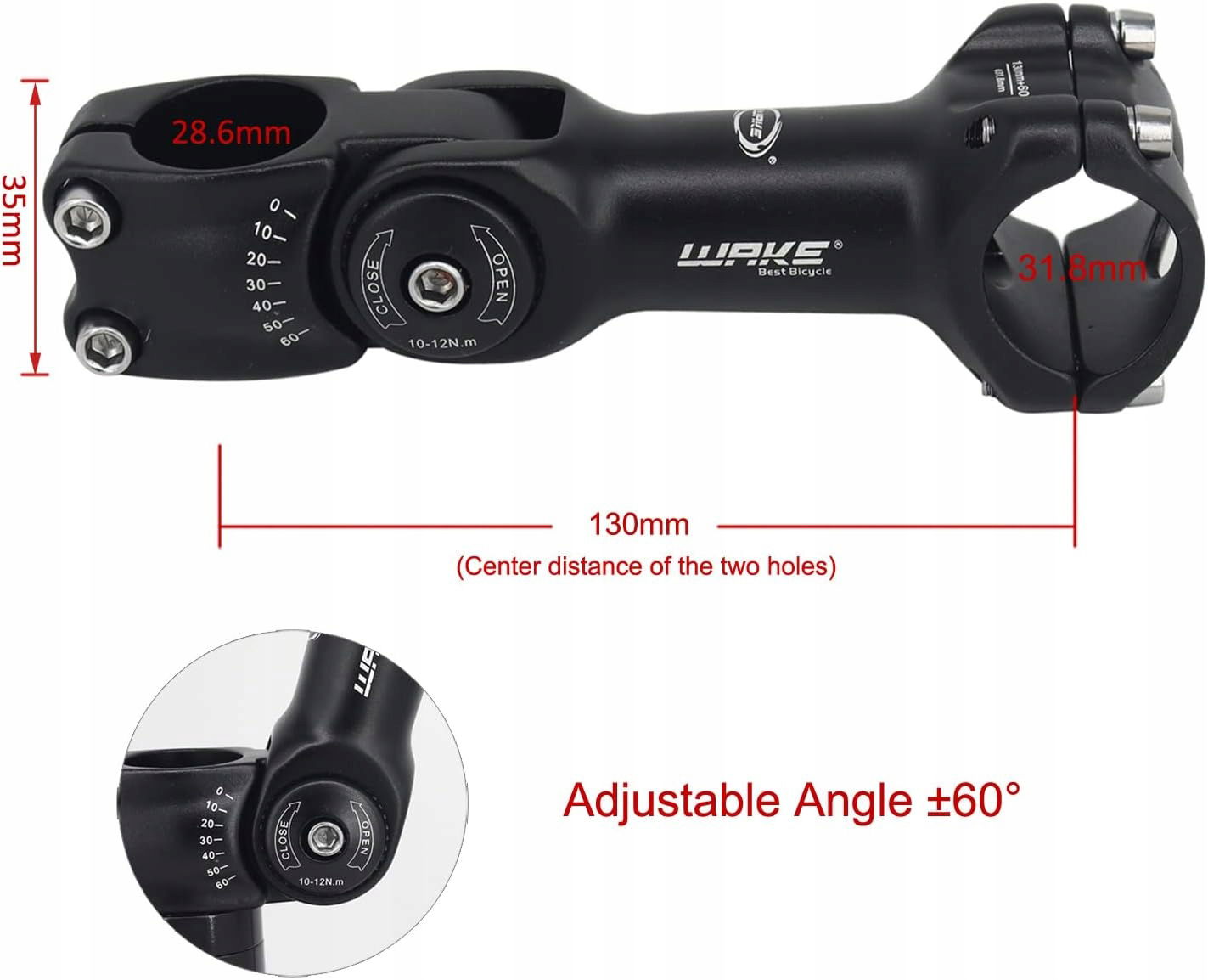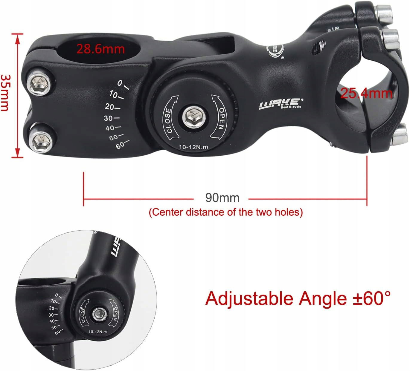 Zastosowanie. Nadaje się do rowerów górskich, wyścigowych, MTB, BMX itd. Łatwa instalacja. Łatwa instalacja, wystarczy podłączyć oryginalny przedni trzonek widelca. Zacisk drążkowy z czterema śrubami utrzymuje drążek bezpiecznie w pozycji. Regulowany kąt. Regulacja w zakresie 0-60°. Popraw swoją pozycję jazdy dzięki regulowanemu wspornikowi WAKE. Rozmiar. Długość: 90 mm/110 mm/130 mm; Średnica zacisku: 31,8 mm/25,4 mm; trzonek widelca: 28,6 mm. Materiał.Wyprodukowano z wysokiej wytrzymałości stopu aluminium frezowanego CNC 6061 T6. Mocna i trwała.