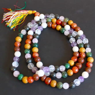 Koraliki w tym buddyjskim różańcu mala zostały wykonane z kamieni naturalnych, takich jak ametyst czy kwarc. Kamieniom przypisuje się unikalne właściwości energetyczne i związki z odpowiednimi planetami astrologicznymi.