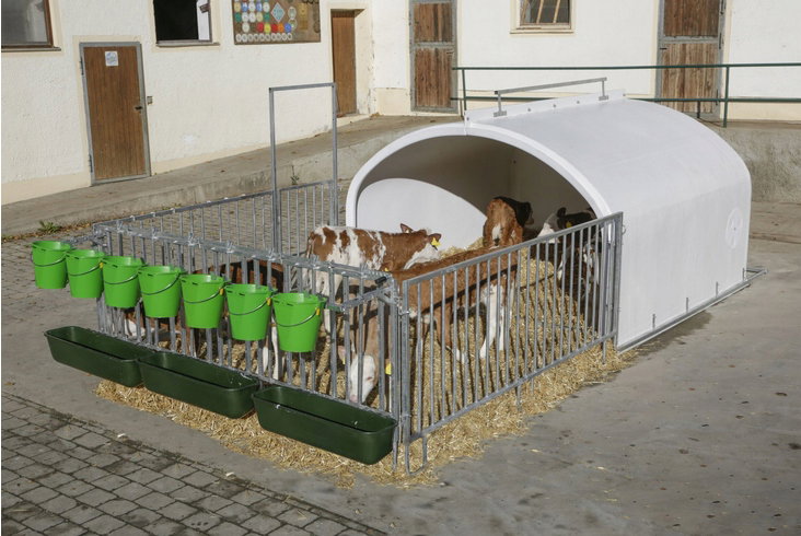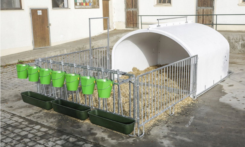 Duży domek dla cieląt wykonany z tworzywa sztucznego wzmocnionego włóknem szklanym oferuje miejsce dla maksymalnie 7 cieląt (należy przestrzegać lokalnych przepisów dotyczących ochrony zwierząt). Dodatkowa rama wzmacniająca wokół kurnika zapewnia najwyższą stabilność nawet dla dużych zwierząt. Obrotowe szczeliny wentylacyjne kontrolują cyrkulację powietrza w tylnej części domu dla cieląt. Do kalenicy dachu domu przymocowana jest zawiesia, które umożliwia łatwe podnoszenie i transport. Cielęcy z ogrodzeniem zapewnia optymalny nadzór i ułatwia kontrolę nad zwierzętami.