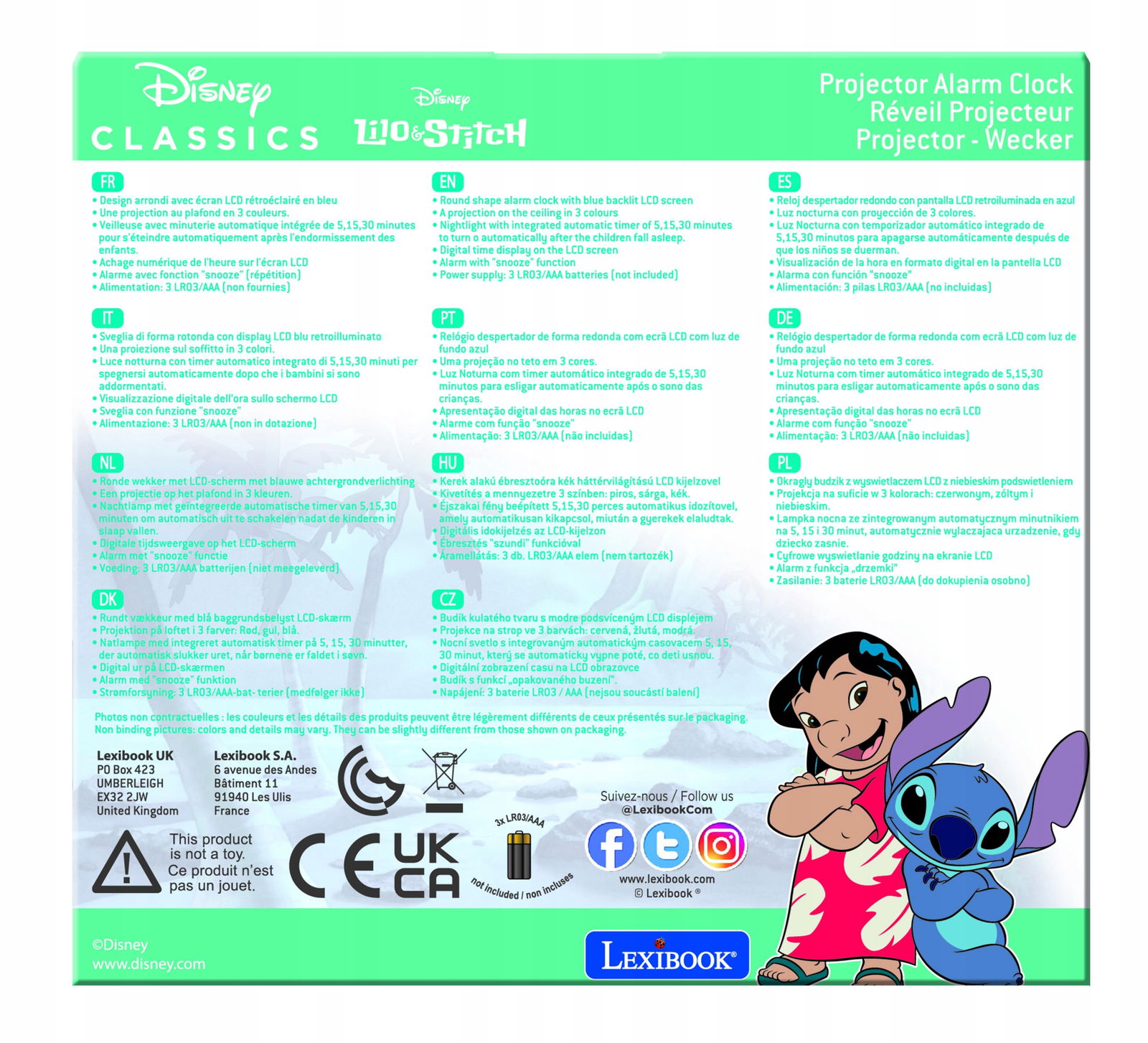 Budzik LEXIBOOK Disney Stitch RL977D to praktyczne i efektowne urządzenie dla dzieci i dorosłych. Wyświetla postać z filmu na suficie w trzech kolorach, pełniąc jednocześnie funkcję lampki nocnej. Posiada intuicyjny interfejs, duże przyciski oraz cyfrowy wyświetlacz LCD z formatem 12/24h. Dzięki timerowi w trzech zakresach (5/10/15 minut) projekcja automatycznie się wyłącza, co pomaga dzieciom spokojnie zasypiać.
