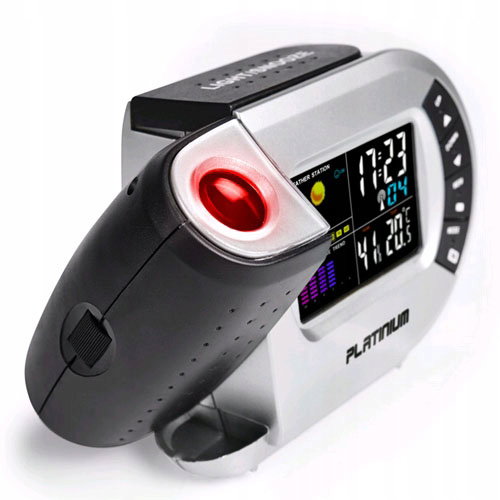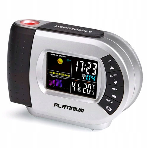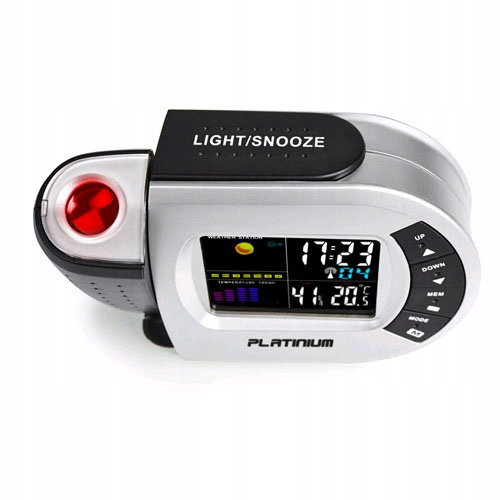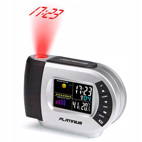 Stacja pogodowa mierzy temperaturę oraz wilgotność powietrza wewnątrz pomieszczenia, oferuje funkcję zegara, budzika i kalendarza. Posiada podświetlany, kolorowy wyświetlacz prezentujący prognozę pogody poprzez symbole graficzne. Dodatkowo za pomocą lasera aktualna godzina może być wyświetlana na ścianie lub suficie, co jest przydatne szczególnie w nocy. Wystarczy spojrzeć na ścianę bez potrzeby sięgania po budzik lub komórkę. Budzik 2w1 może być zasilany przez baterie lub dołączony zasilacz.