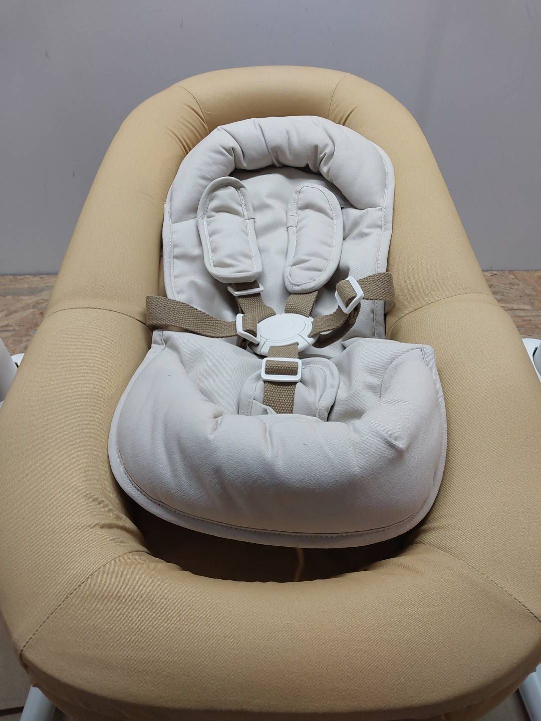 - Bezpieczeństwo: Wyposażony w pasy bezpieczeństwa, które chronią dziecko podczas bujania.