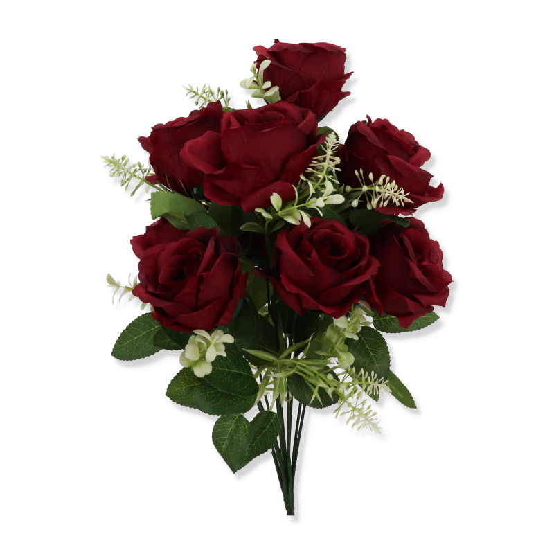 Bukiet 10 sztucznych róż w kolorze bordowym.