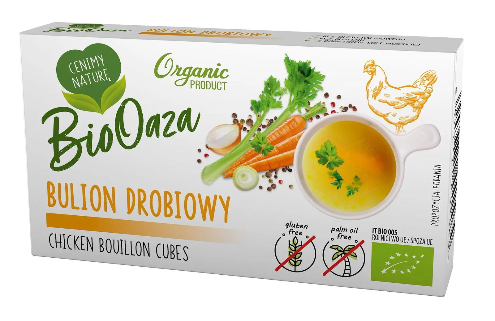sól morska, skrobia kukurydziana*, miso* (SOJA*, ryż*, woda, sól, koji), oleje roślinne* (tłuszcz shea*, oliwa z oliwek z pierwszego tłoczenia*), tłuszcz z kurczaka*, mięso z kurczaka* 5 % (gotowany kurczak*, przeciwutleniacz – ekstrakty z rozmarynu* (wyciągi z rozmarynu)), ekstrakt z drożdży, suszone warzywa* w zmiennych proporcjach 1,1 % (cebula*, SELER*, marchew*, pietruszka*, czosnek*, natka pietruszki*), przyprawy*. (* składniki pochodzące z upraw ekologicznych)