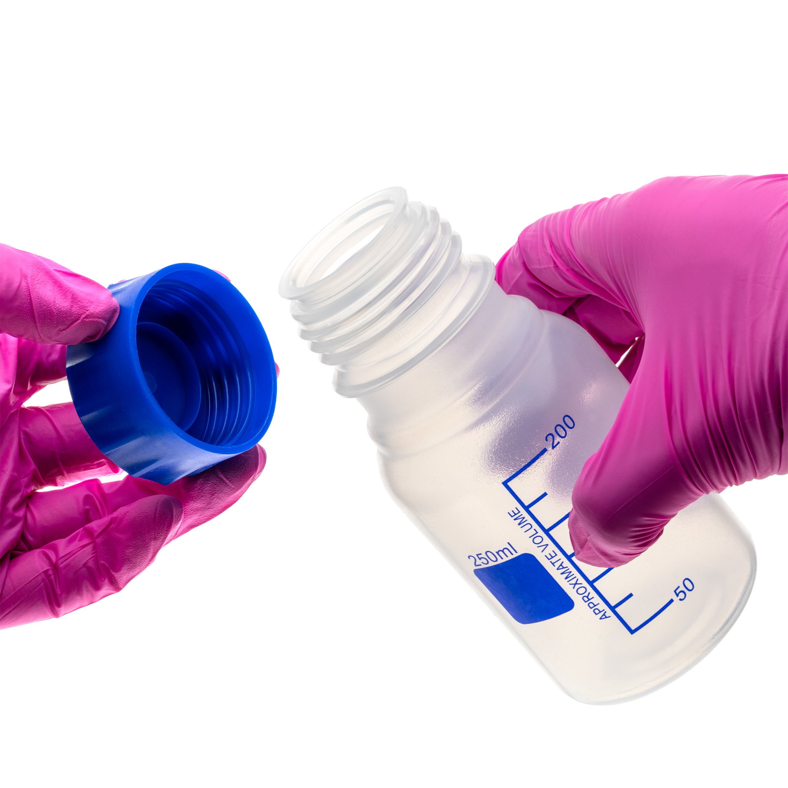 Butelka z nakrętką GL45 wykonana z trwałego, przezroczystego polipropylenu (PP). Charakteryzuje się wysoką odpornością chemiczną oraz możliwością sterylizacji w autoklawie w temperaturze do 121 °C. Szeroki wlew umożliwia łatwe napełnianie materiałami w postaci proszku, pasty lub cząstek. Butelka wyposażona jest w trwałe, nadrukowane podziałki w kolorze niebieskim, które są bardziej czytelne niż klasyczne podziałki wytłoczone, oraz w pole do opisu również w kolorze niebieskim, ułatwiające identyfikację zawartości. Specjalnie zaprojektowana nakrętka zapewnia wygodne i szybkie otwieranie.