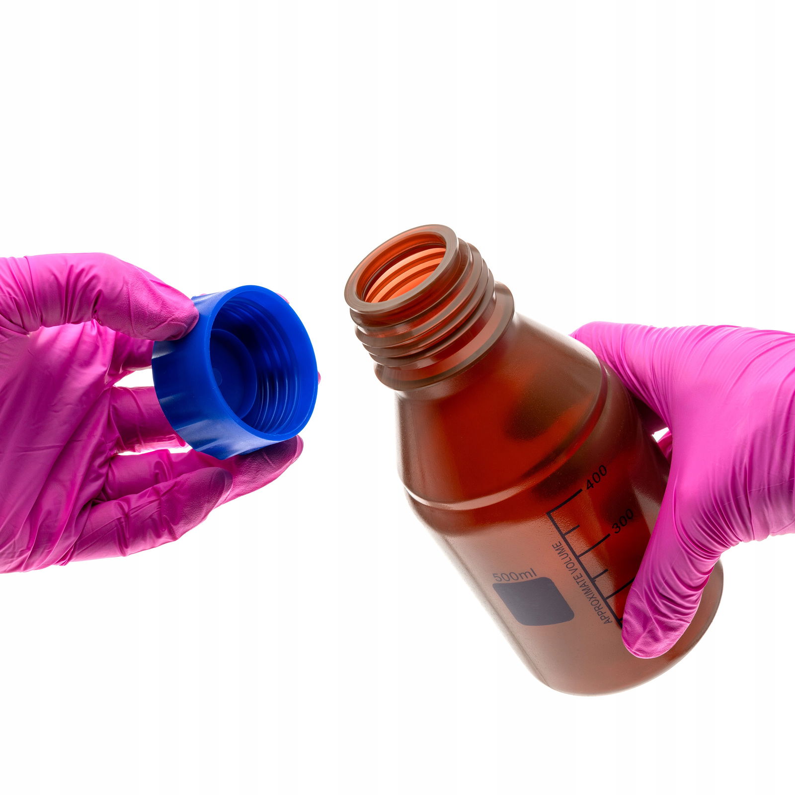 Butelka z nakrętką GL45 wykonana z trwałego, przezroczystego polipropylenu (PP). Charakteryzuje się wysoką odpornością chemiczną oraz możliwością sterylizacji w autoklawie w temperaturze do 121 °C. Szeroki wlew umożliwia łatwe napełnianie materiałami w postaci proszku, pasty lub cząstek. Butelka wyposażona jest w trwałe, nadrukowane podziałki w kolorze niebieskim, które są bardziej czytelne niż klasyczne podziałki wytłoczone, oraz w pole do opisu również w kolorze niebieskim, ułatwiające identyfikację zawartości. Specjalnie zaprojektowana nakrętka zapewnia wygodne i szybkie otwieranie.