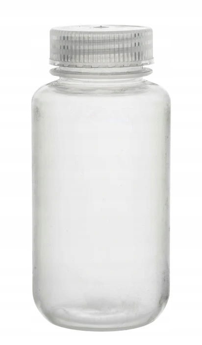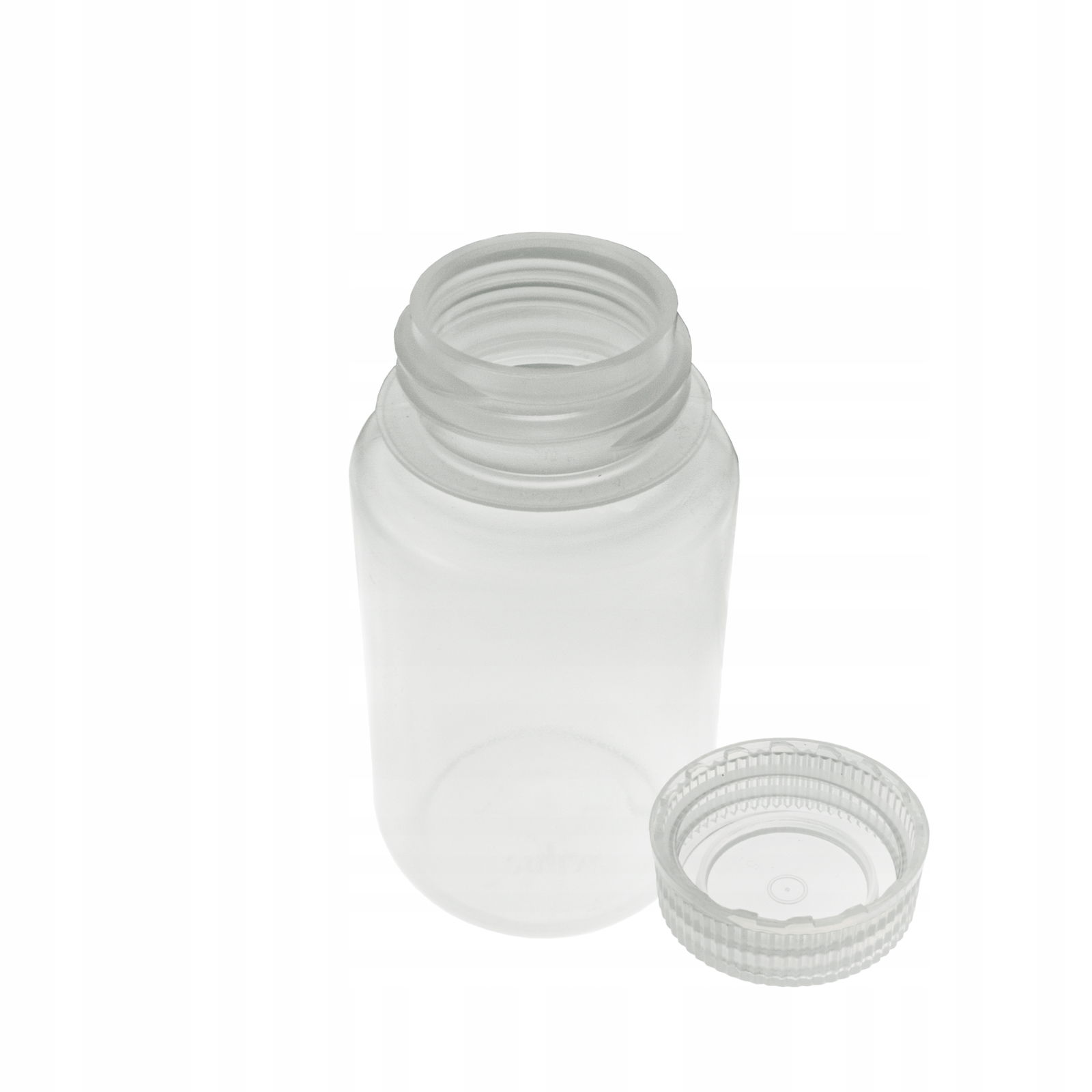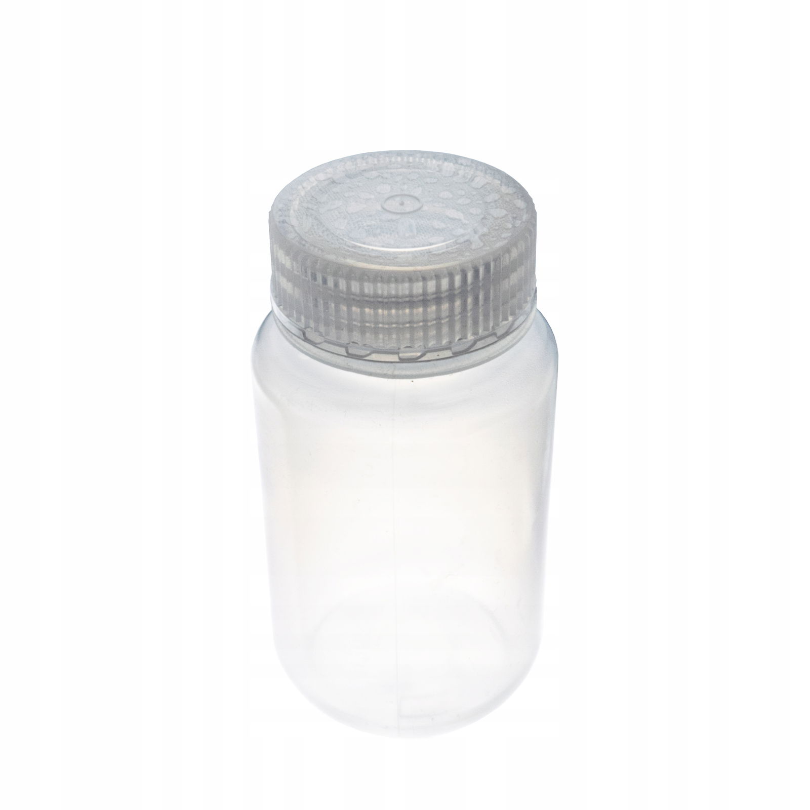Przeźroczysta butelka laboratoryjna z polipropylenu PP. W komplecie z przeźroczystą nakrętką.