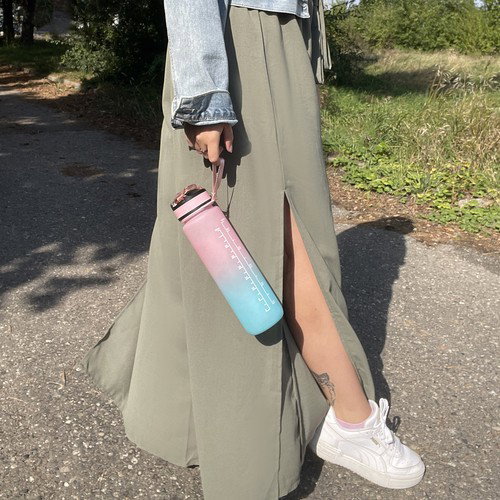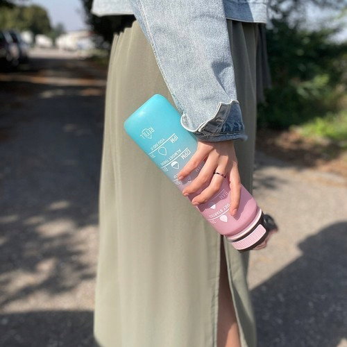 - WYSOKIEJ JAKOŚCI MATERIAŁ - butelka motywująca 1 L wykonana została z wytrzymałego, bezpiecznego dla zdrowia materiału PP (polipropylen), co czyni ją lekką, a jednocześnie odporną na uderzenia. Ustnik wykonano z miękkiego, bezpiecznego dla zębów i dziąseł silikonu, co zapewnia komfort podczas picia. Butelka jest w pastelowym kolorze różowo-niebieskim, co nadaje jej estetycznego i modnego wyglądu, pasującego do codziennego użytku. W środku znajduje się długa, wyjmowana rurka, dzięki której nie trzeba przechylać butelki, by pić – wystarczy zassać płyn przez ustnik. Z bidonu można korzystać w temperaturze od -20°C do 80°C.