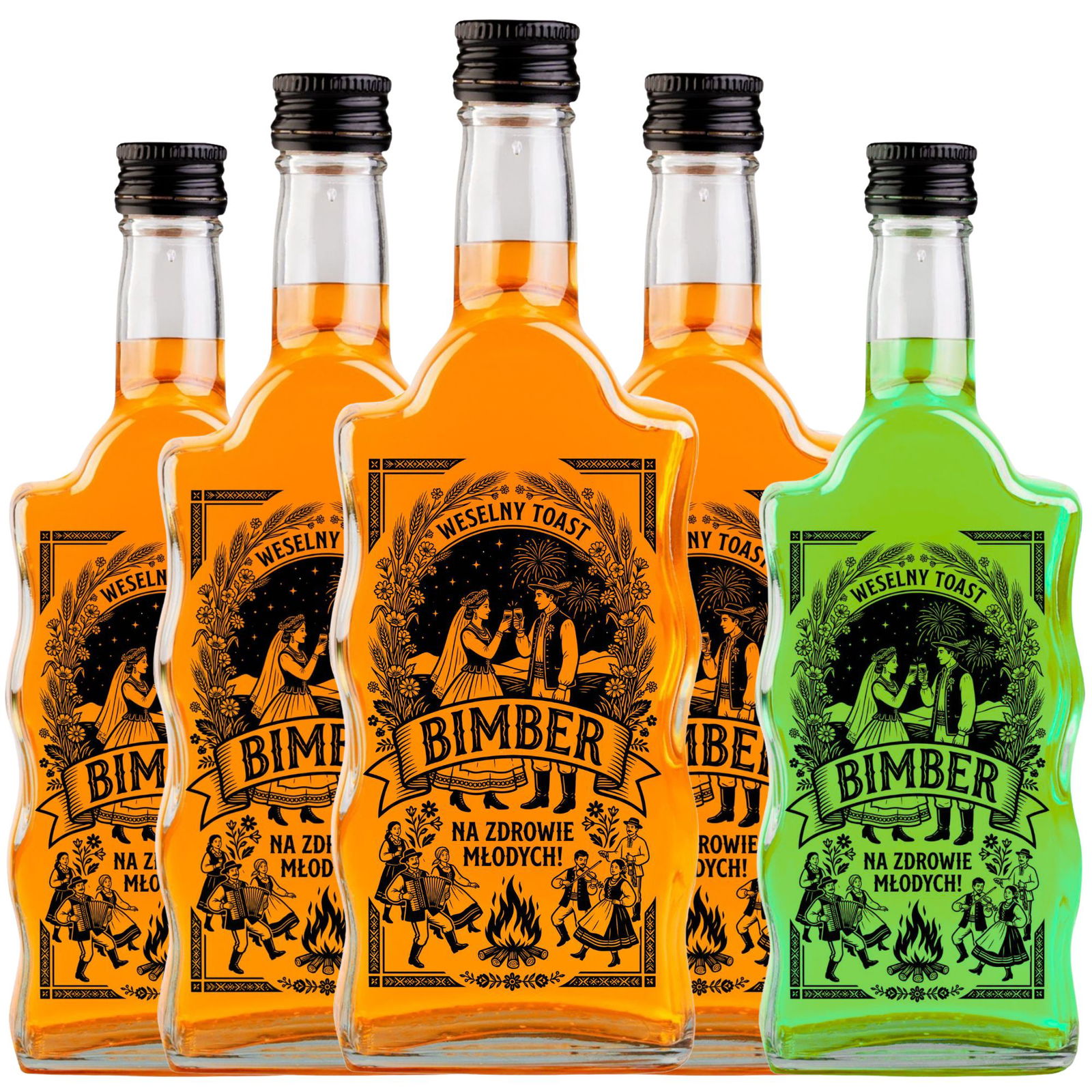- Główny napis w stylu retro: "BIMBER - WESELNY TOAST".