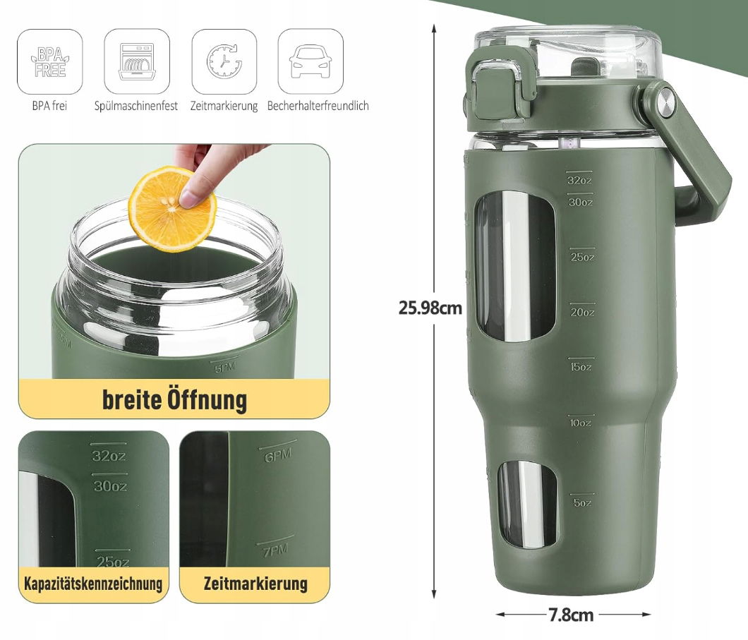 - ✴️BEZPIECZEŃSTWO UŻYCIA: Nasza butelka na wodę ze szkła borokrzemianowego o pojemności 960 ml jest bezpieczna w użyciu, można ją myć w zmywarce, jest szczelna i nie zawiera BPA, BPS, PVC, ołowiu ani kadmu. Te wytrzymałe i wielokrotnego użytku szklane butelki na wodę nie pękną pod wpływem ekstremalnych temperatur i ciśnienia.
