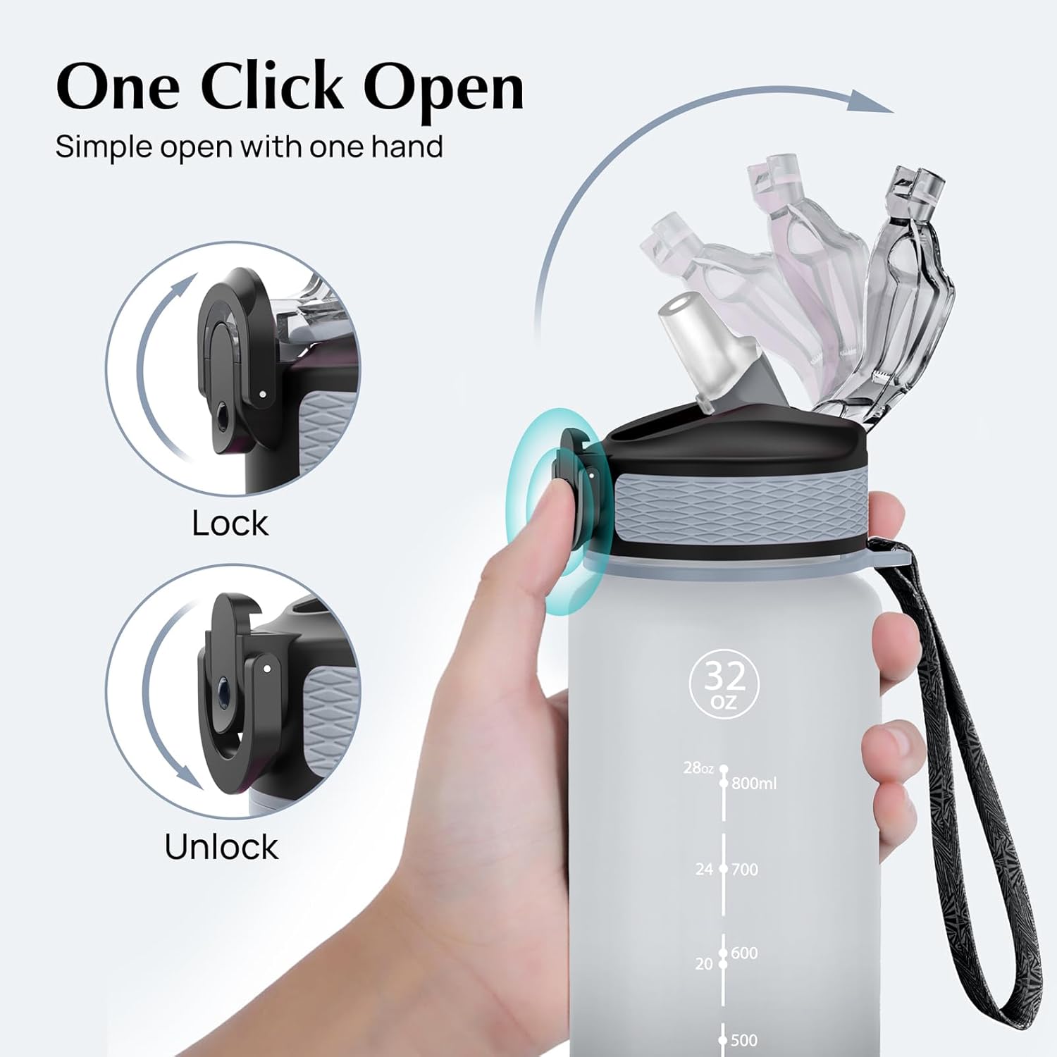 Zaprojektowany specjalnie dla Twojego intensywnego stylu życia, zamykany zamek błyskawiczny i wygodny pierścionek na jedną rękę. Otwór zamka wyposażony jest w silikonową dyszę ze słomką na dyszy, która zapobiega zakłóceniom w przepływie wody. Duży otwór ułatwia umieszczanie lodu i owoców, a także skuteczne czyszczenie.