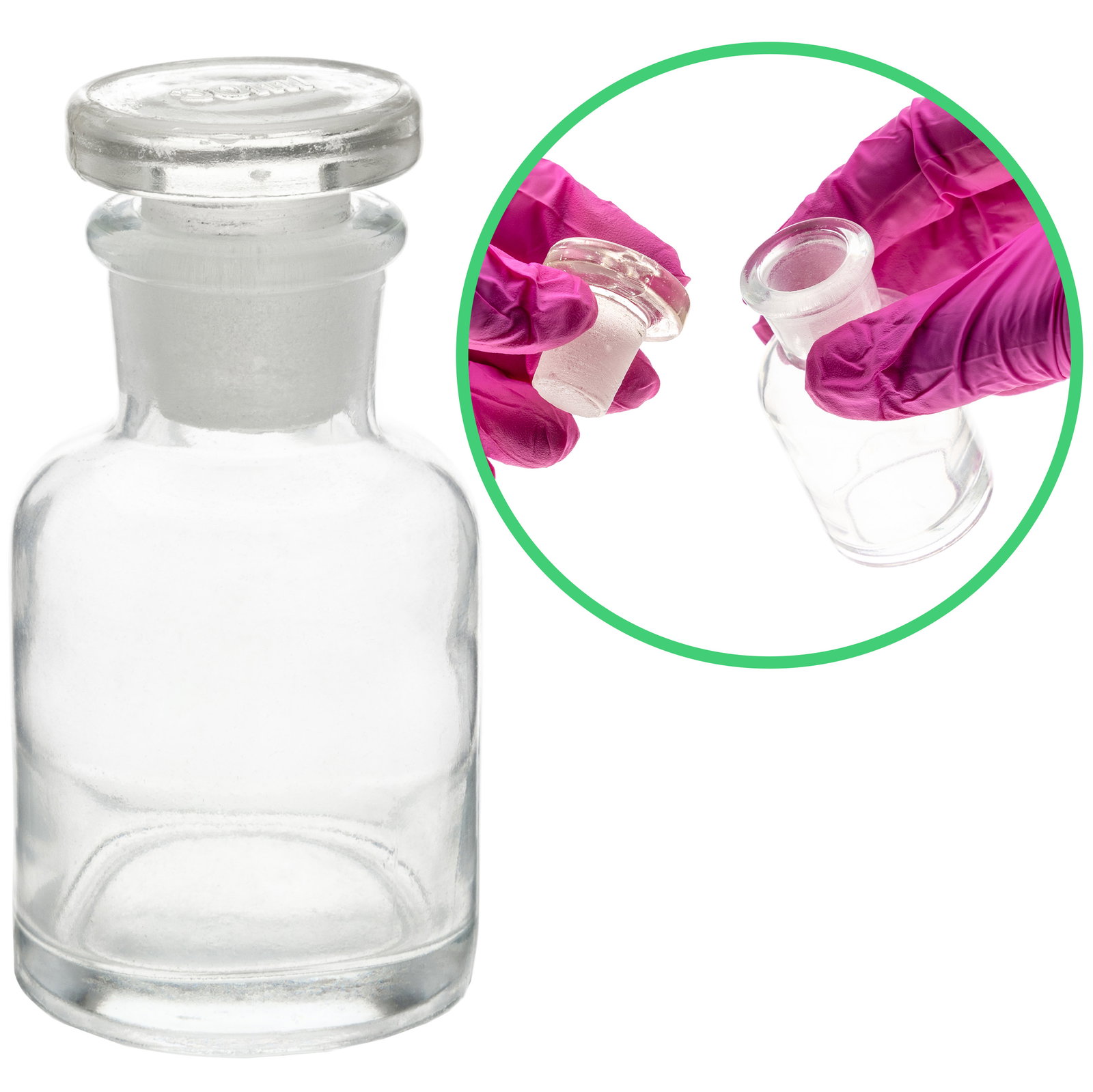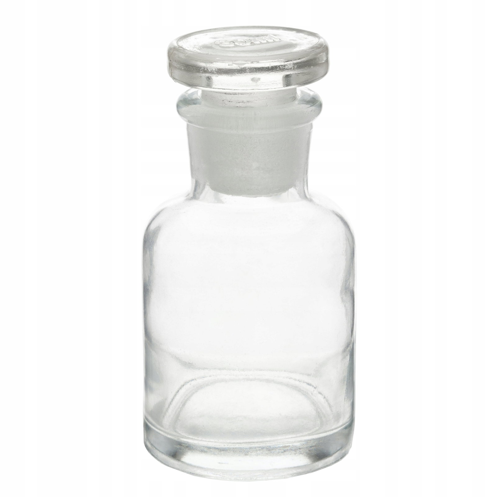 Butelka laboratoryjna z wąską szyjką i szlifem, wykonana z wysokiej jakości z bezbarwnego szkła sodowo-wapniowego. Zapewnia precyzyjne zamknięcie korkiem szklanym.