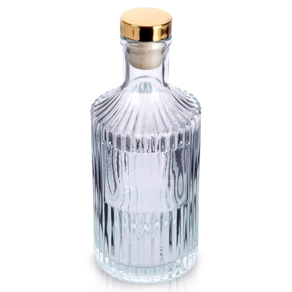 Butelka z prążkowanego szkła ze złotym korkiem, prezentuje się niezwykle elegancko. Dzięki niej możemy wygodnie przechowywać i serwować wino, likier, nalewki czy domowy syrop. Butelka jest zamykana na korek, co zapewni jej szczelność. Jest łatwa w czyszczeniu i wygodna w użytkowaniu. Butelka świetnie sprawdzi się zarówno w użytku domowym, ale również w gastronomii. Jej wyjątkowy design sprawi, że pięknie wkomponuje się w każde wnętrze. Doskonały pomysł na prezent.