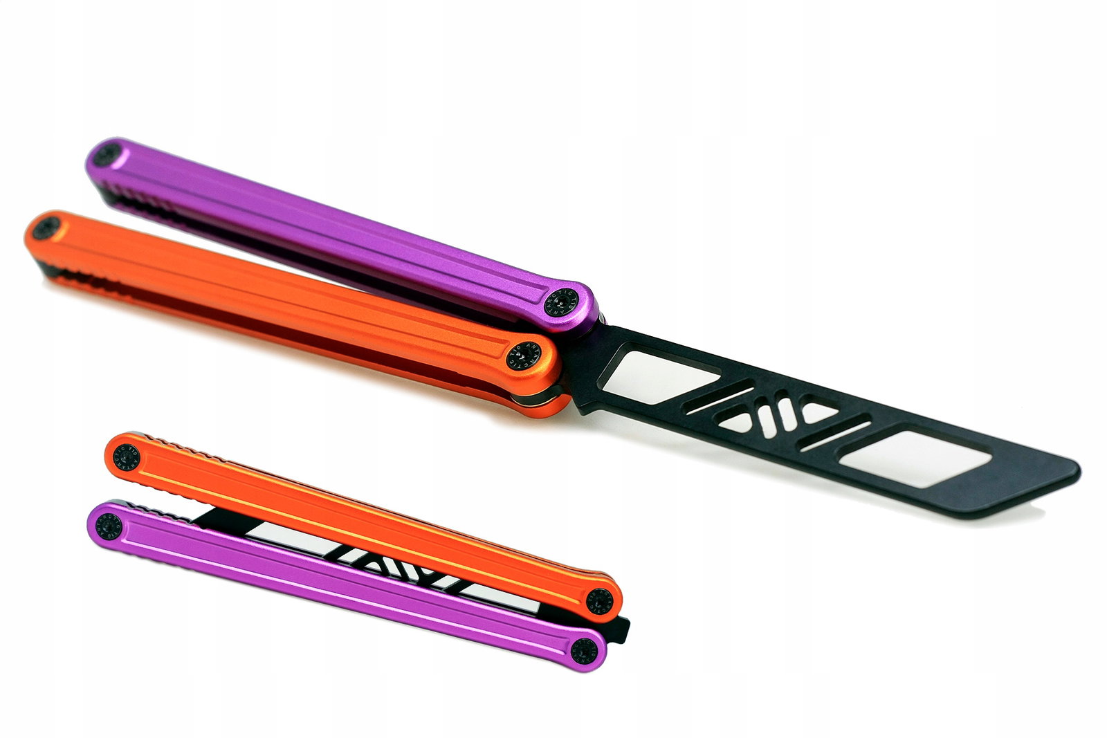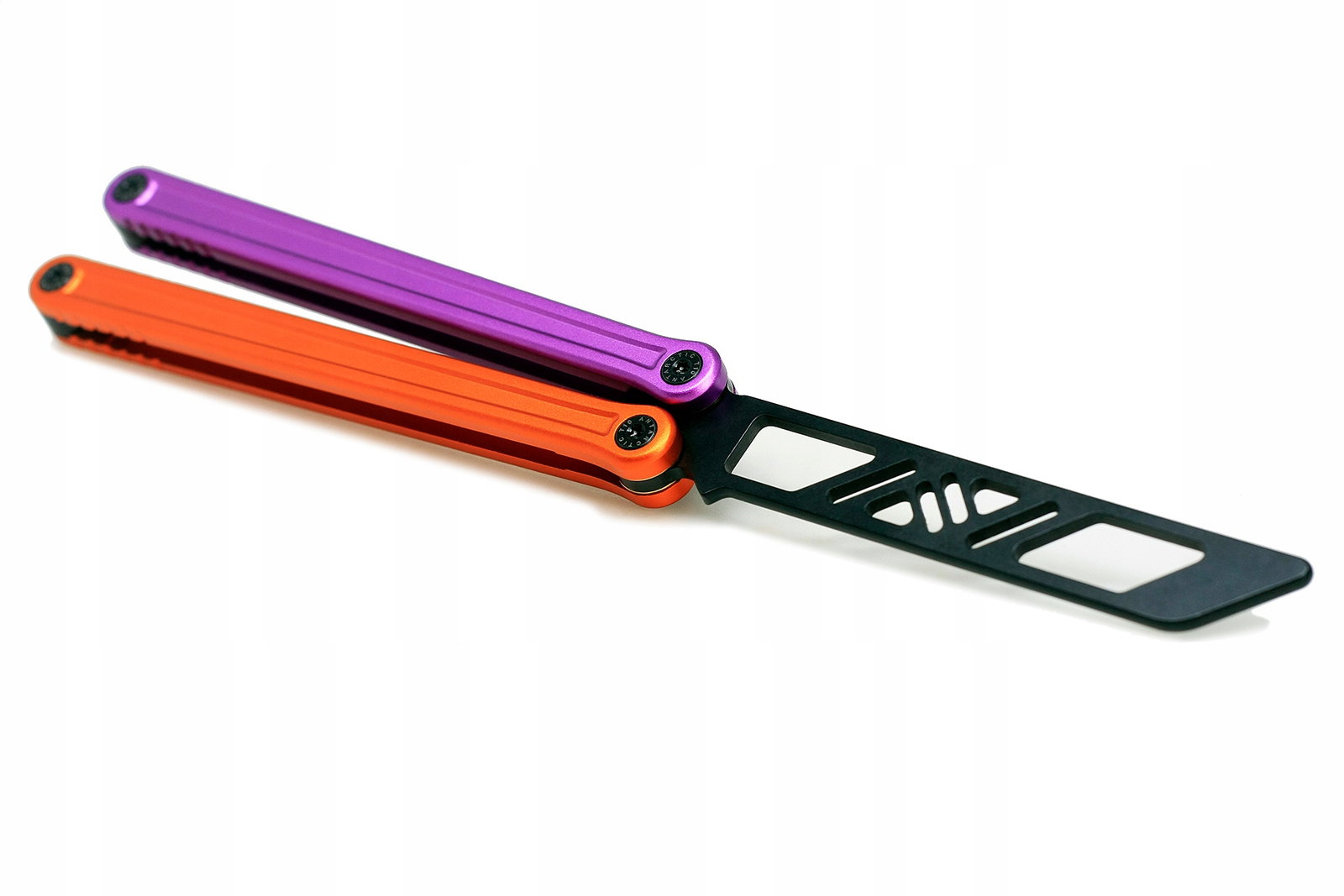 Oryginalny składany nóż typu butterfly. Nóż ma grubą, zaokrągloną i niezaostrzoną końcówkę dzięki czemu idealnie nadaje się do treningu. Oryginalne wzornictwo i doskonałe materiały wykonania. Klasyczny nóż typu "motyl" z głownią typu tanto wykonaną ze stali nierdzewnej (precyzyjny mechanizm na tulejach !!!, co zapewnia niezawodność/bezawaryjność produktu). Wyróżnij się!!!