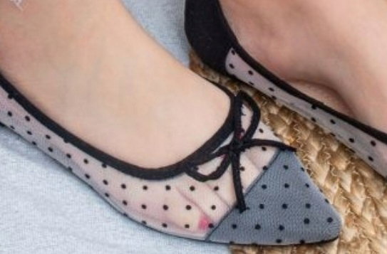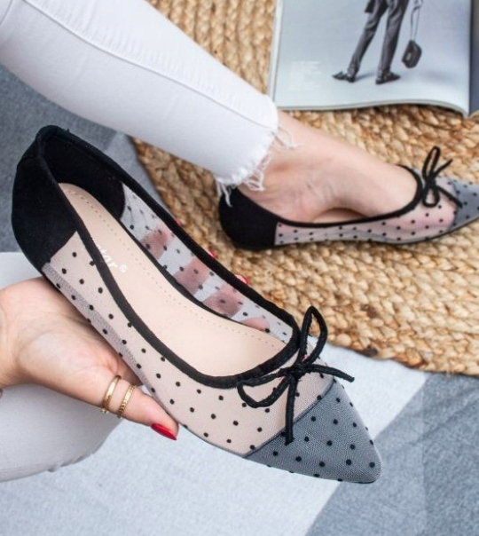 Połyskujące wstawki z przodu i z tyłu buta, delikatna kokardka oraz grochy w stylu retro na przezroczystej siatce podkreślają kobiecy charakter obuwia.
