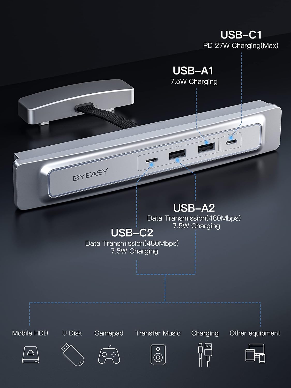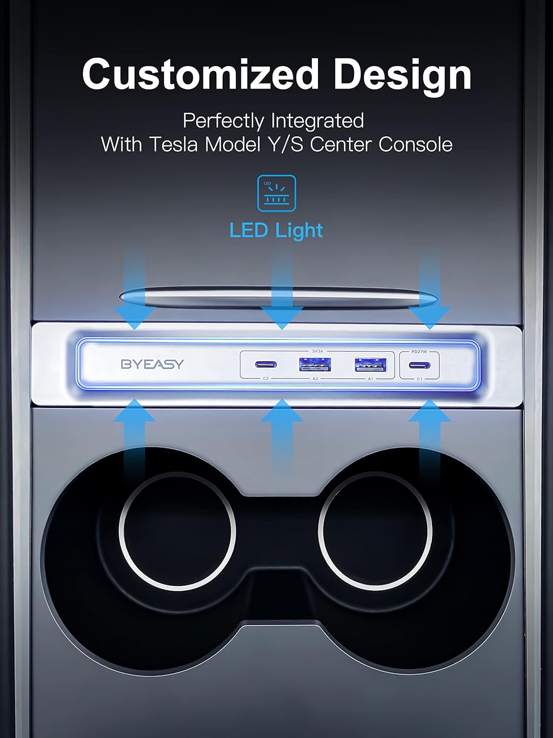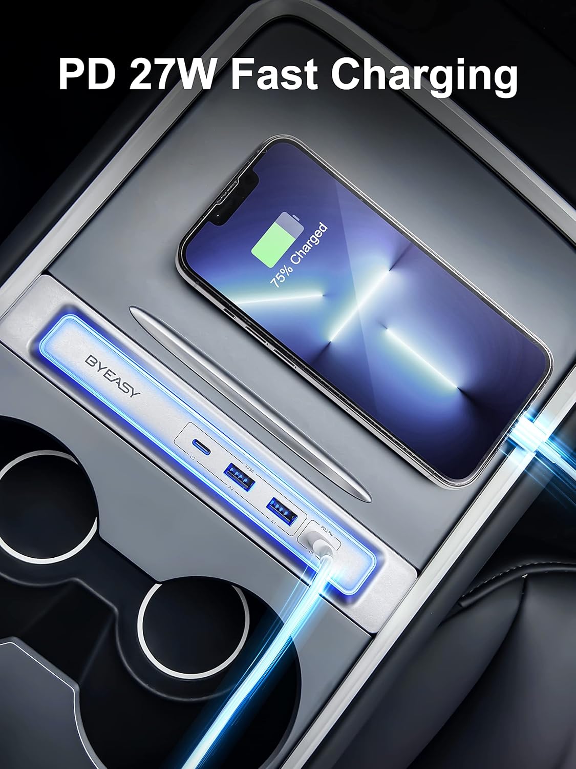 BYEASY Tesla Hub USB do modelu 3/Y (2021/2022), wieloportowa stacja dokująca 4-w-2 z 2 portami USB i 2 portami typu C, obsługuje ładowanie PD 27 W i transmisję danych do rozszerzenia rozdzielacza