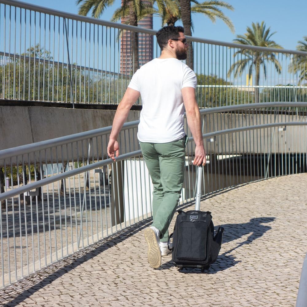 Rozszerzana kieszeń na butelki z zamkiem błyskawicznym z boku. Wyprodukowano z wytrzymałego, pochodzącego z recyklingu poliestru rPET. Tylny pas do wózka do użytku z większym bagażem na kółkach.