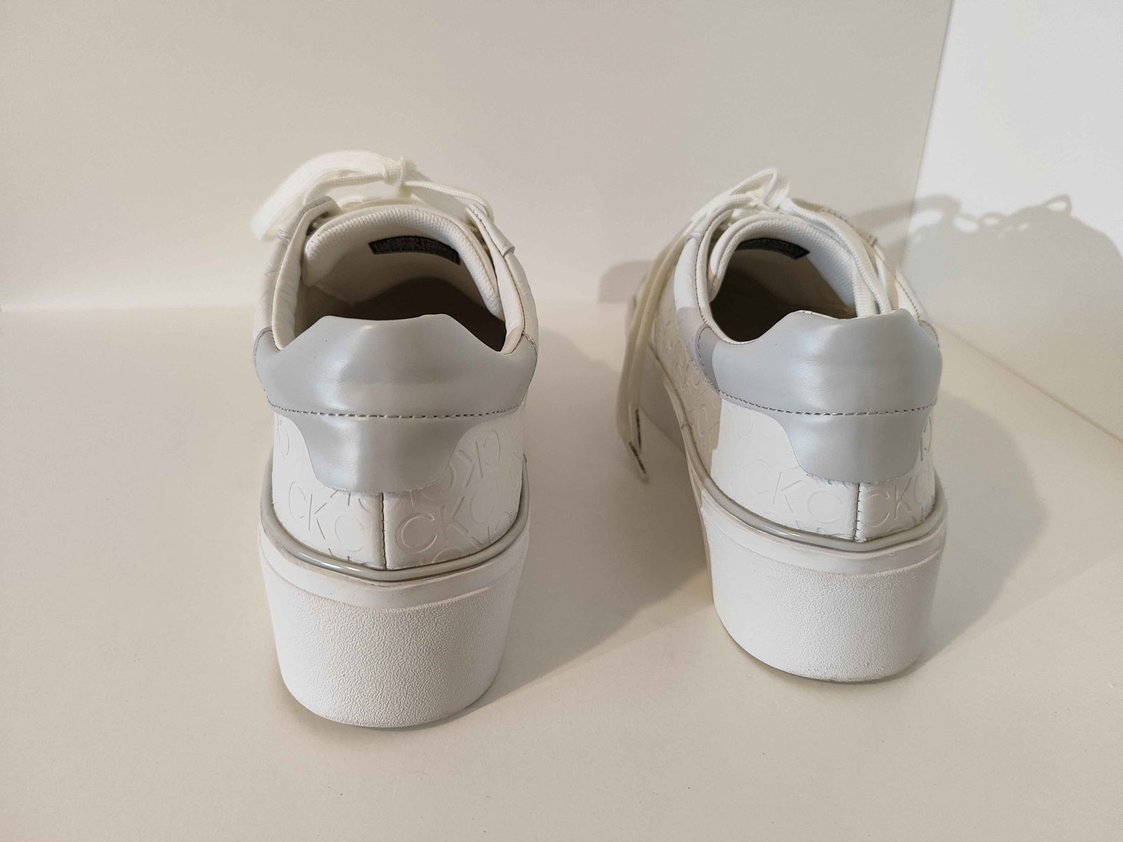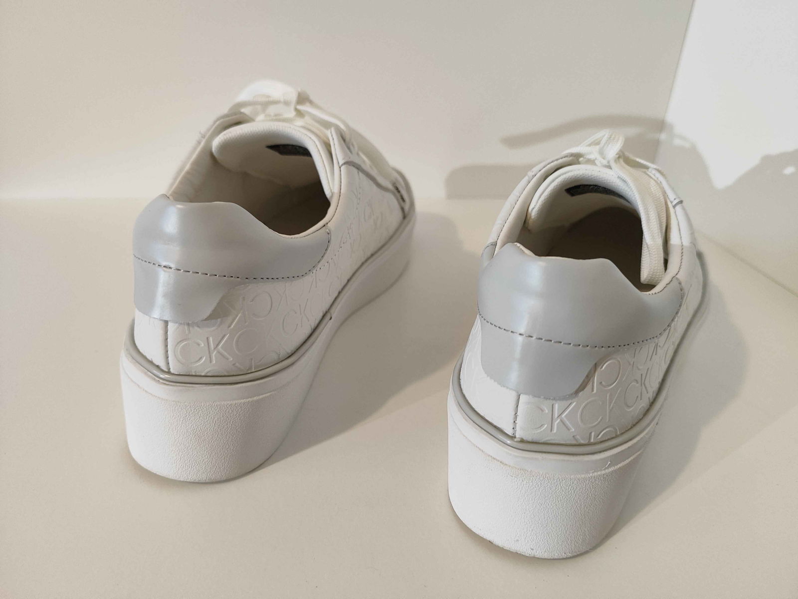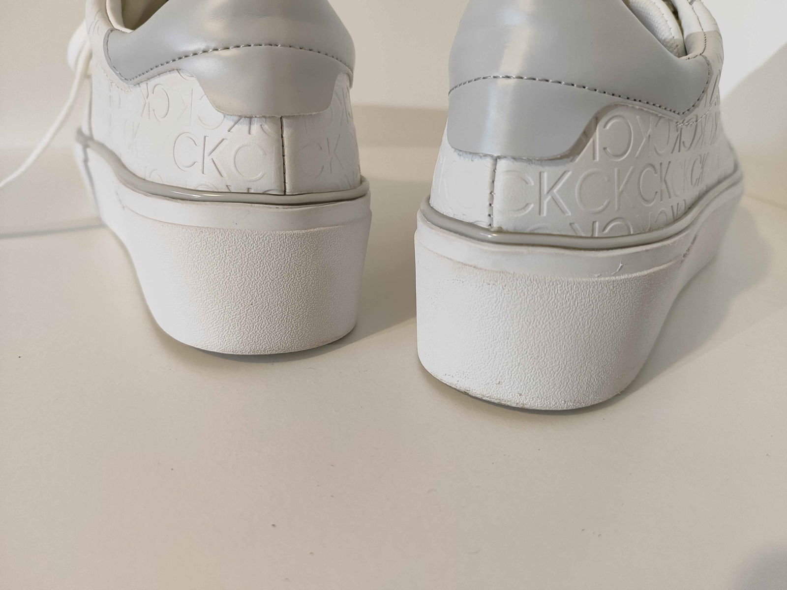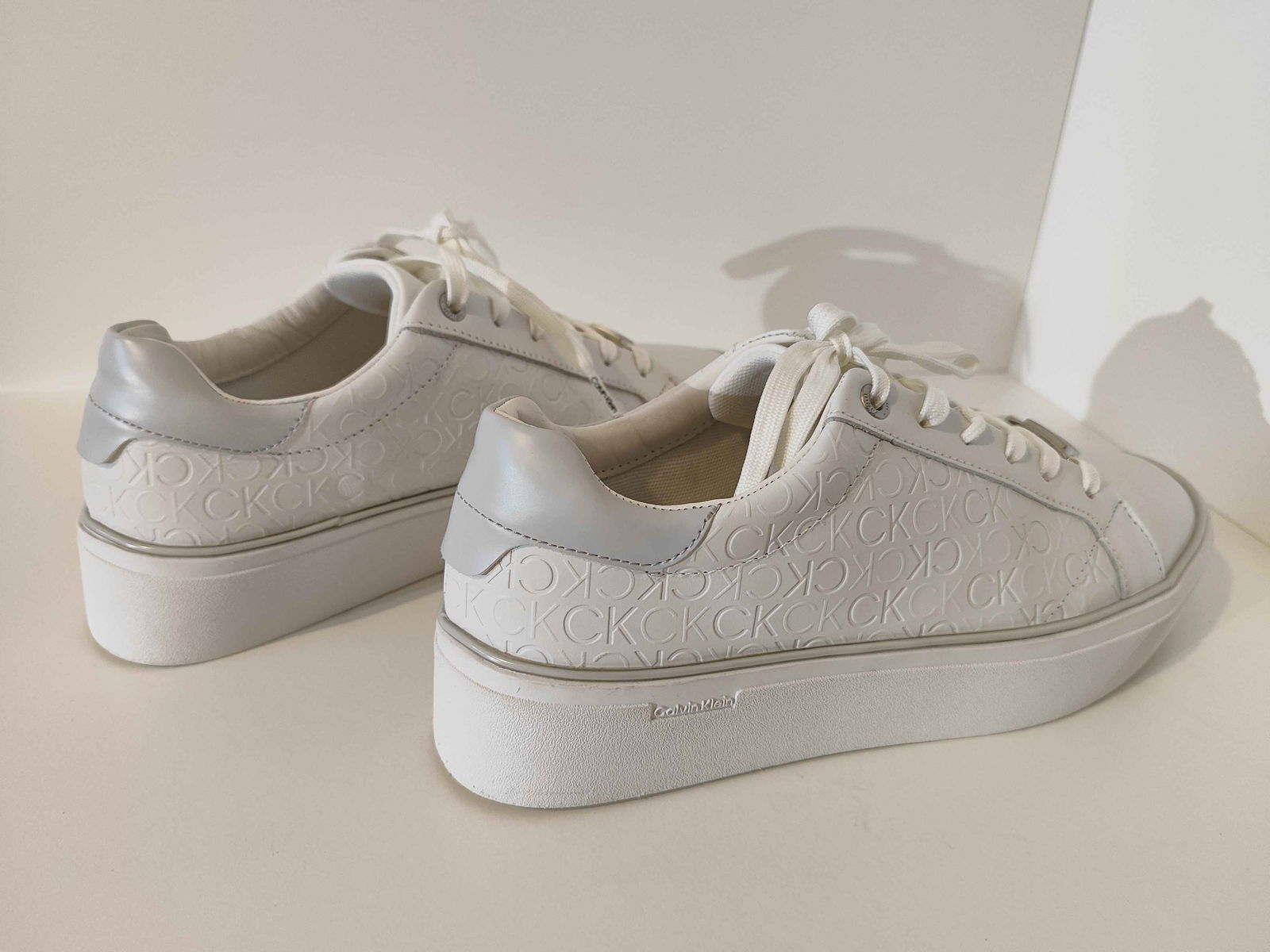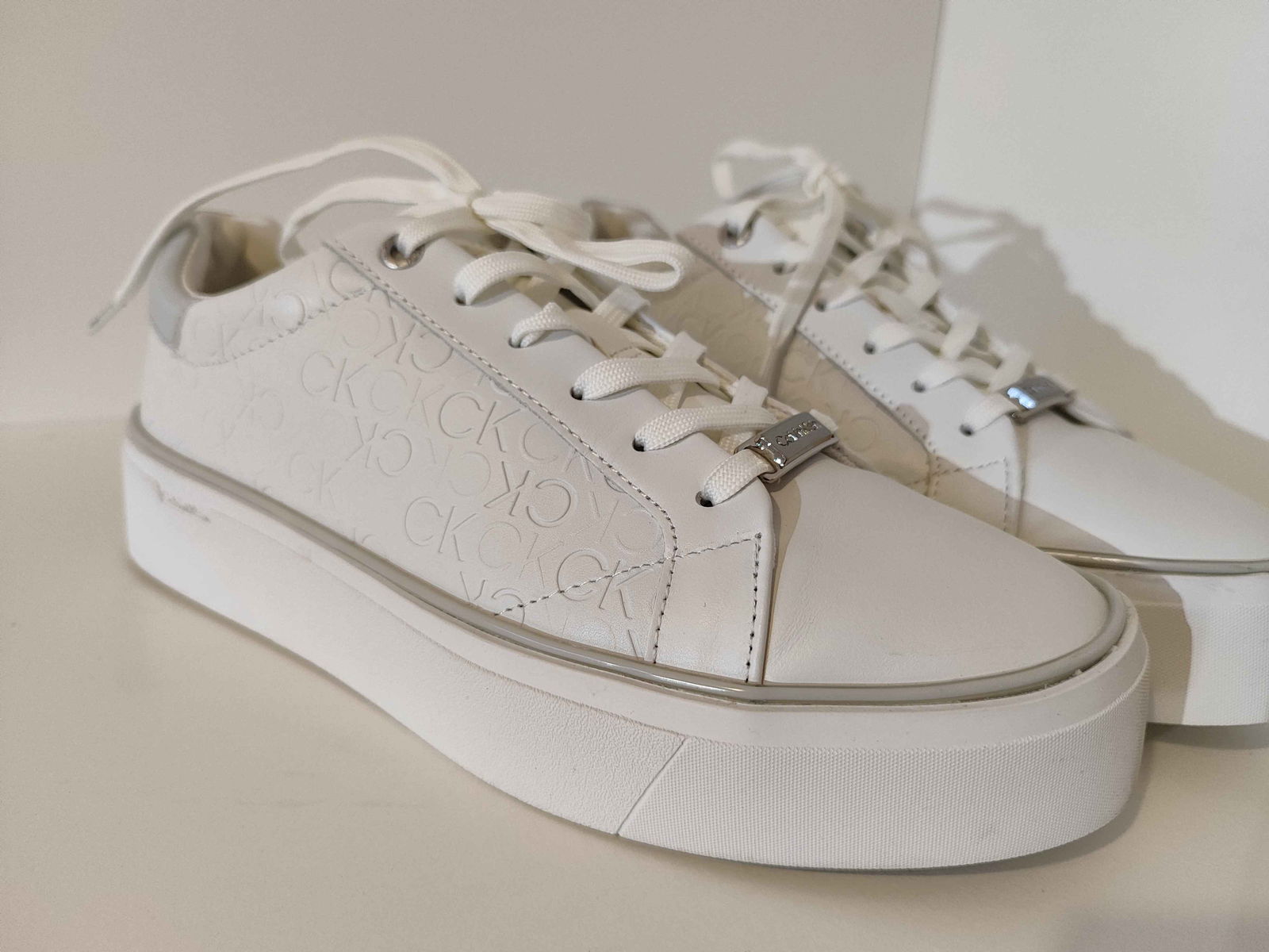 - Cholewka: Biała powierzchnia, bez pęknięć i rozdarć. Wytłoczone logo „CK” oraz srebrne akcenty są nienaruszone i czyste.