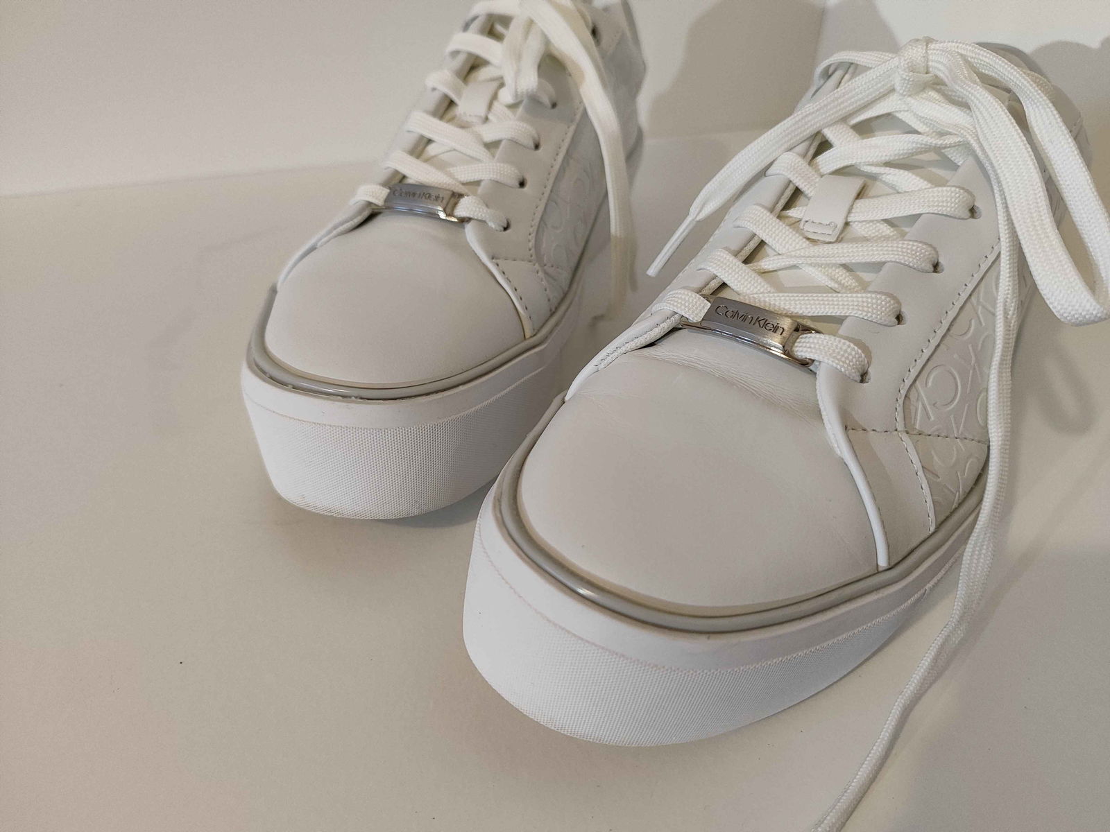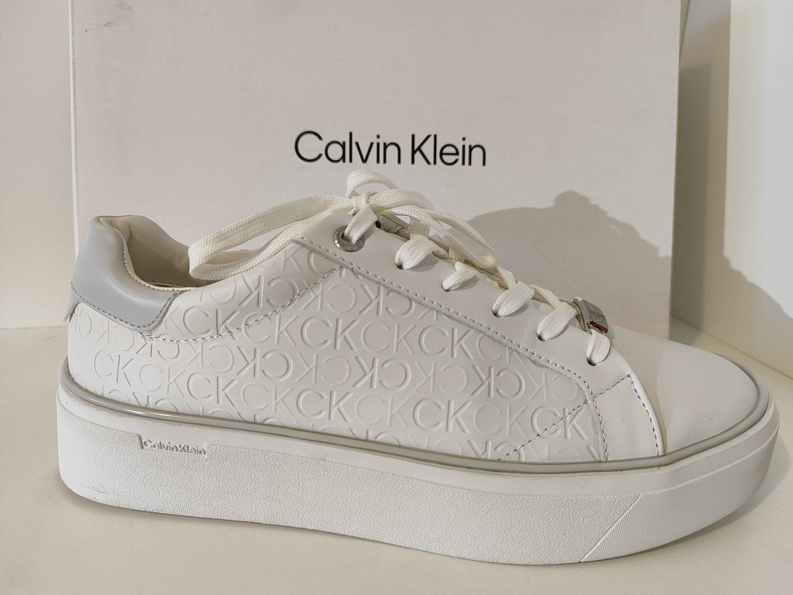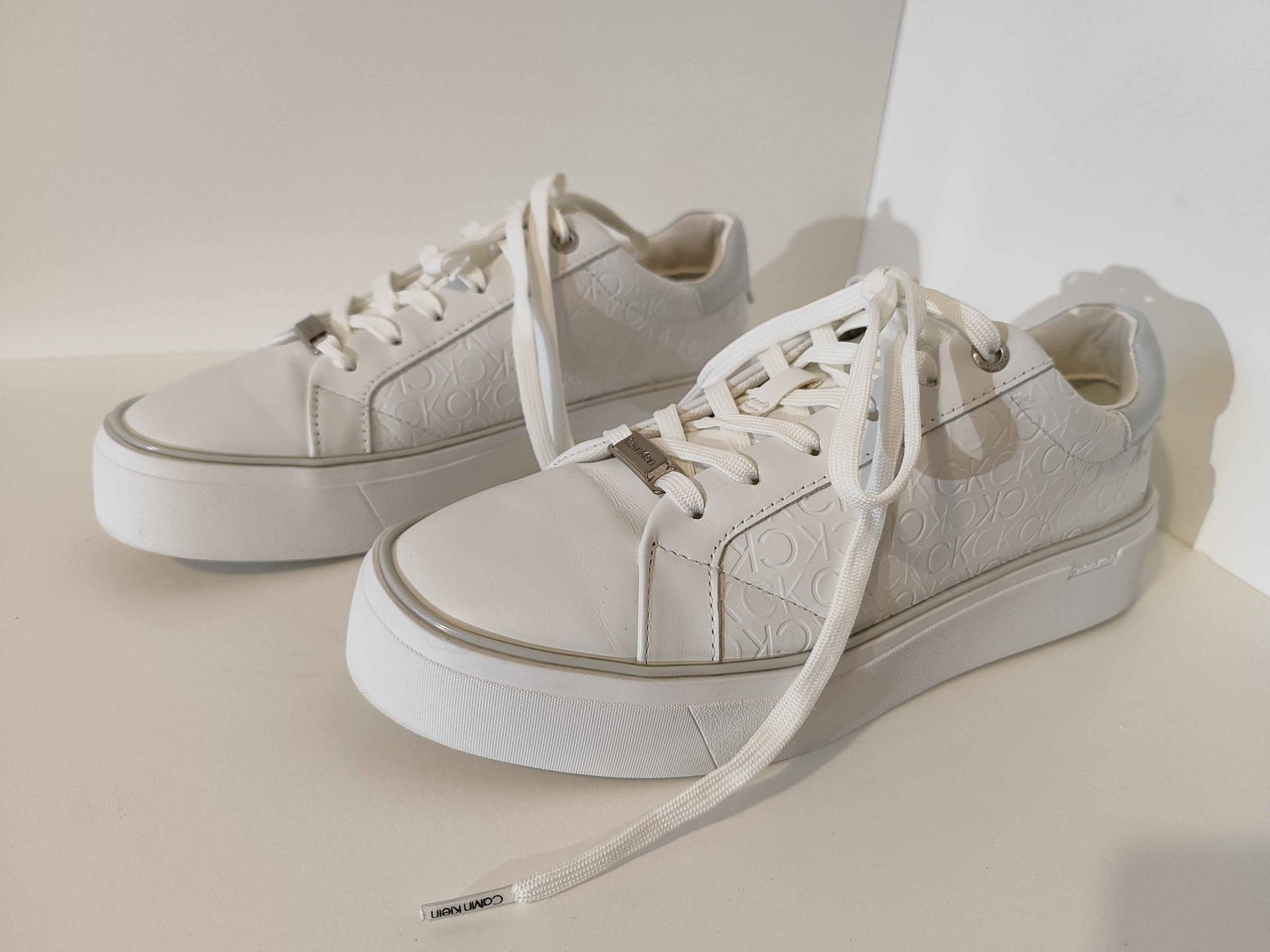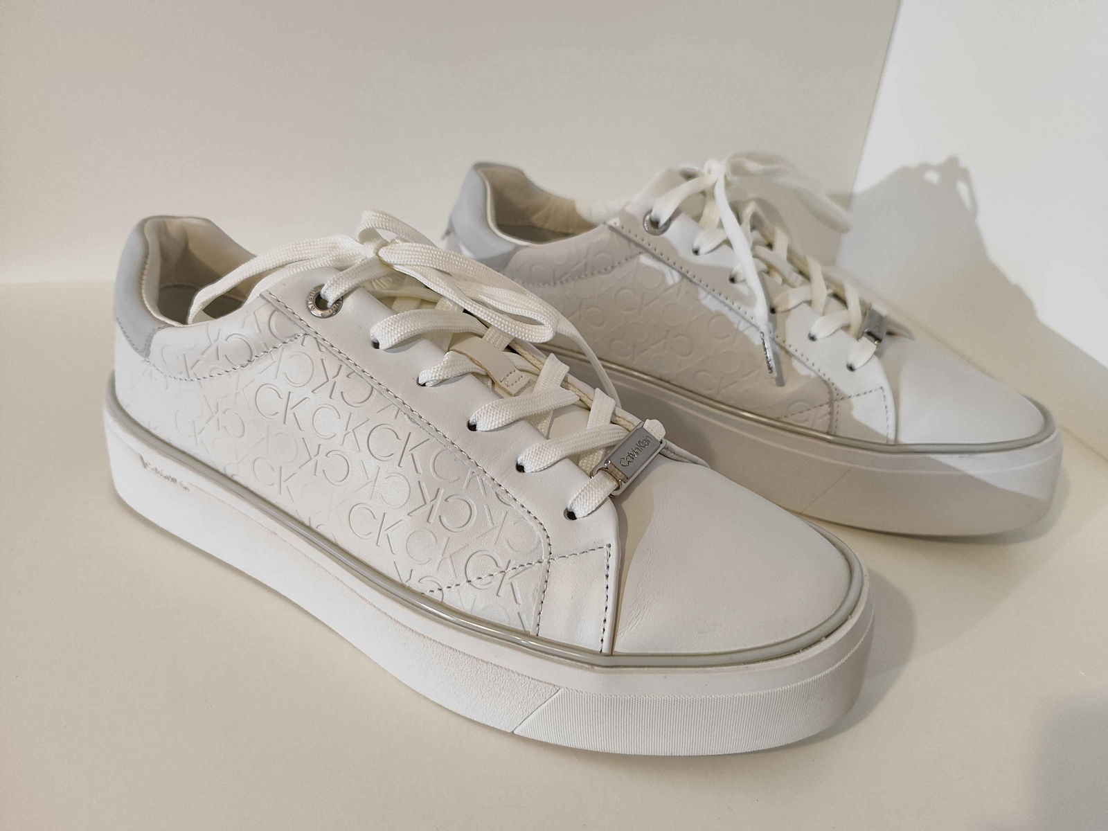 - Cholewka: Biała powierzchnia, bez pęknięć i rozdarć. Wytłoczone logo „CK” oraz srebrne akcenty są nienaruszone i czyste.