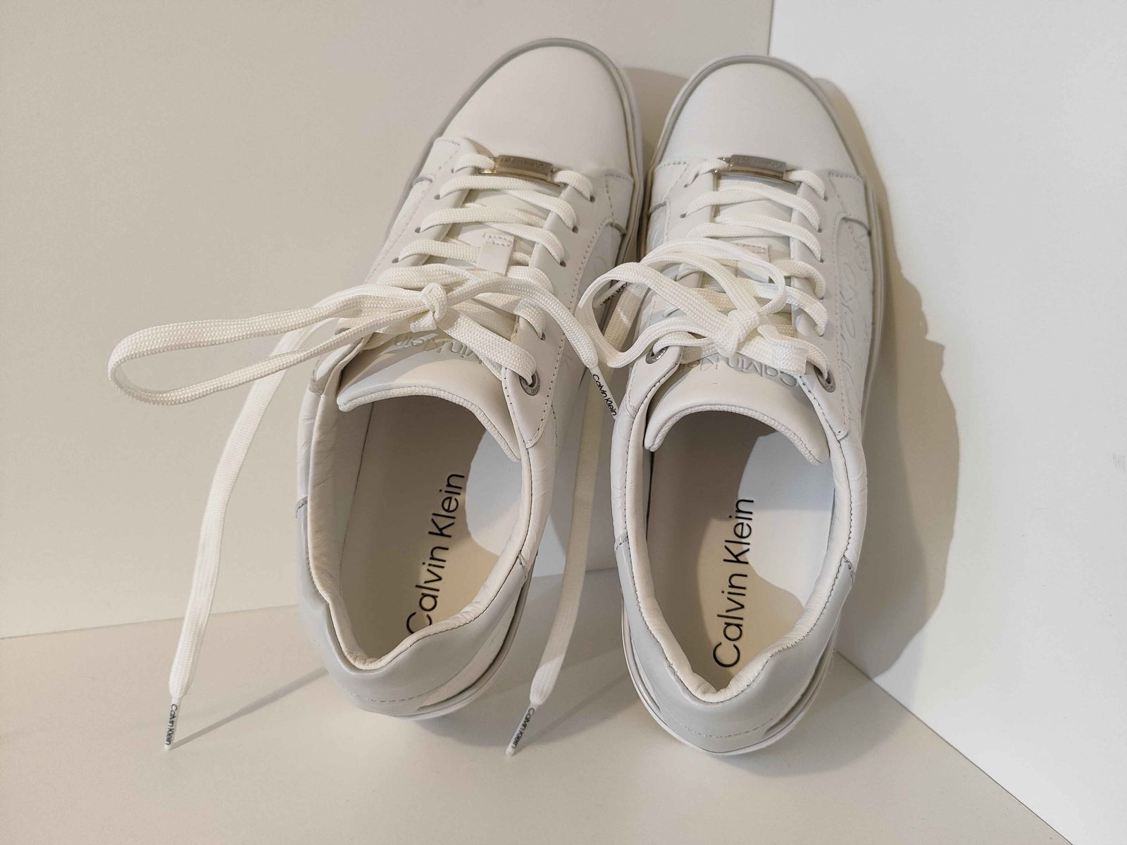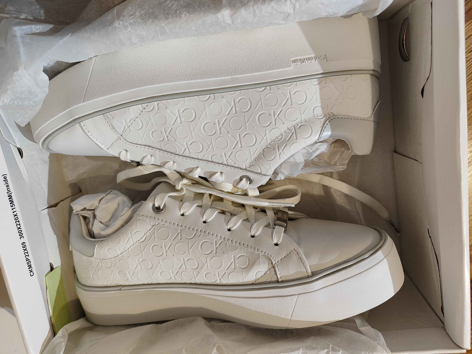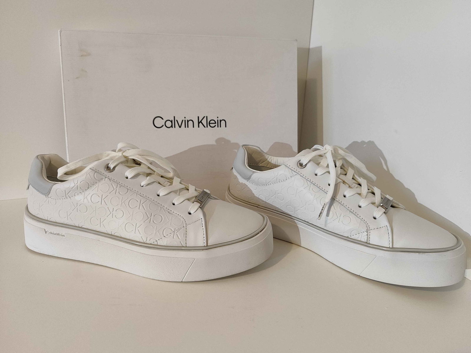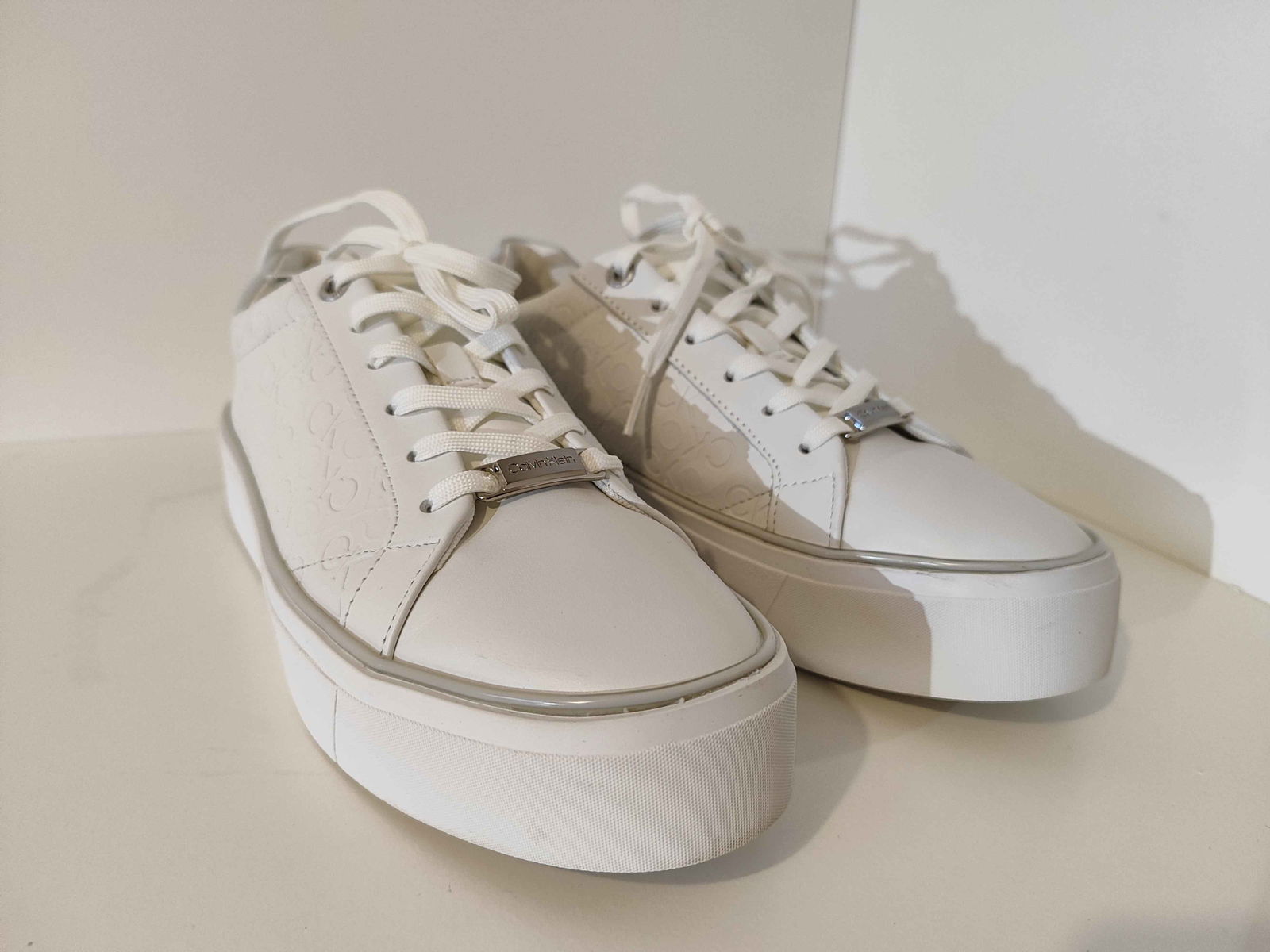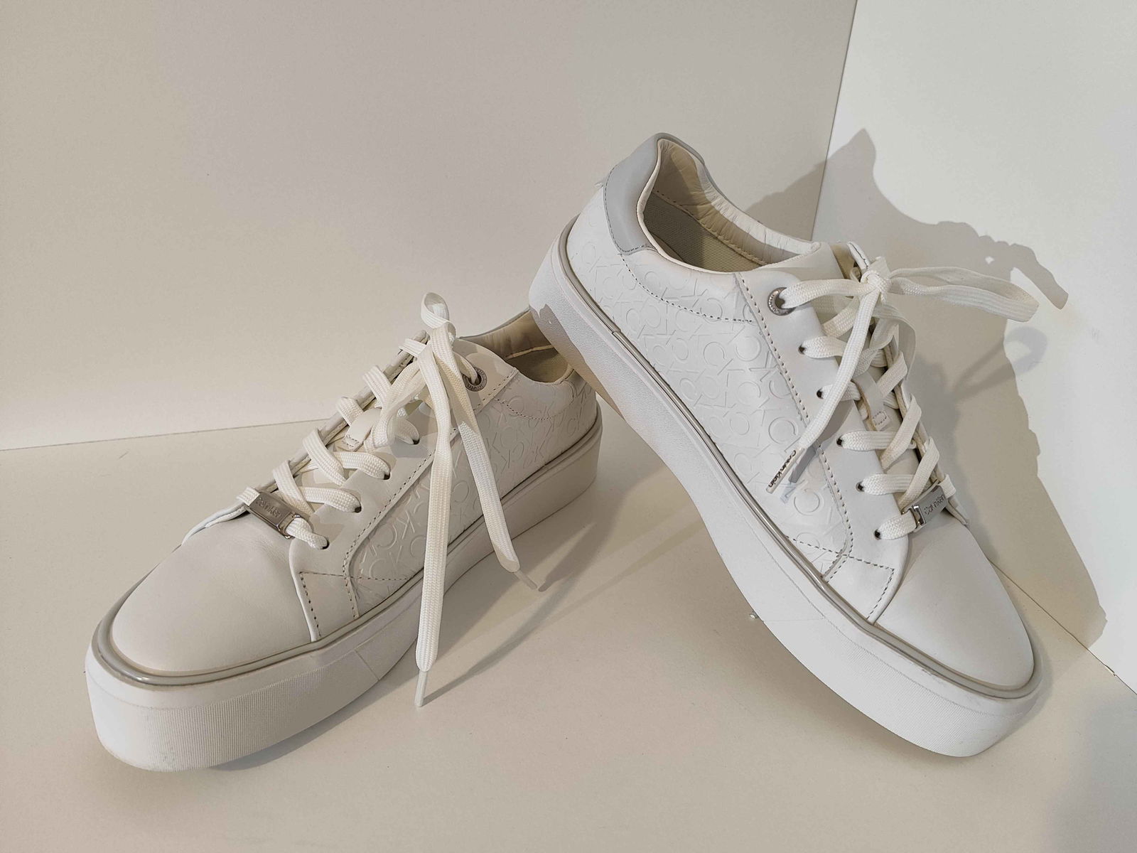- Cholewka: Biała powierzchnia, bez pęknięć i rozdarć. Wytłoczone logo „CK” oraz srebrne akcenty są nienaruszone i czyste.