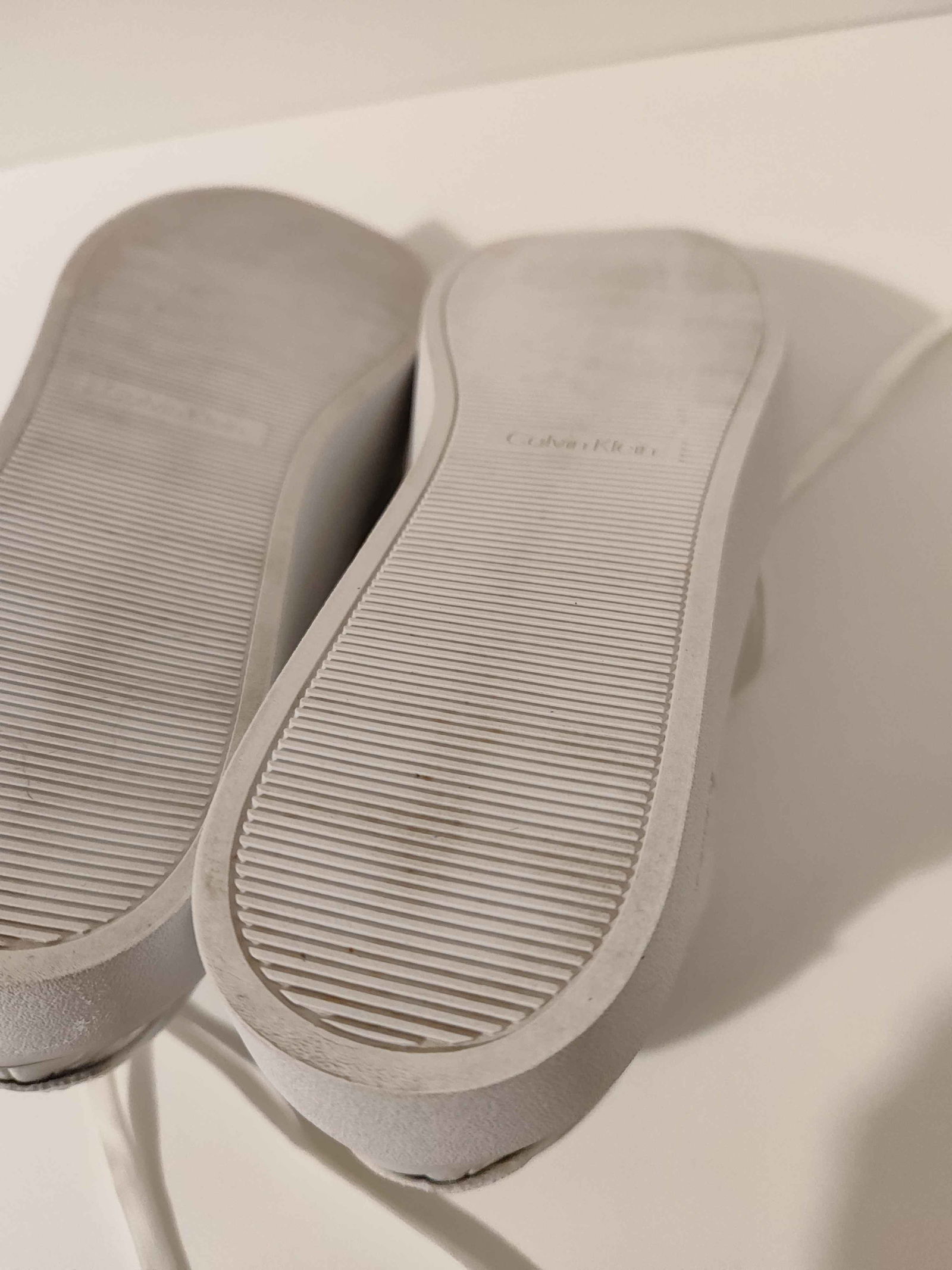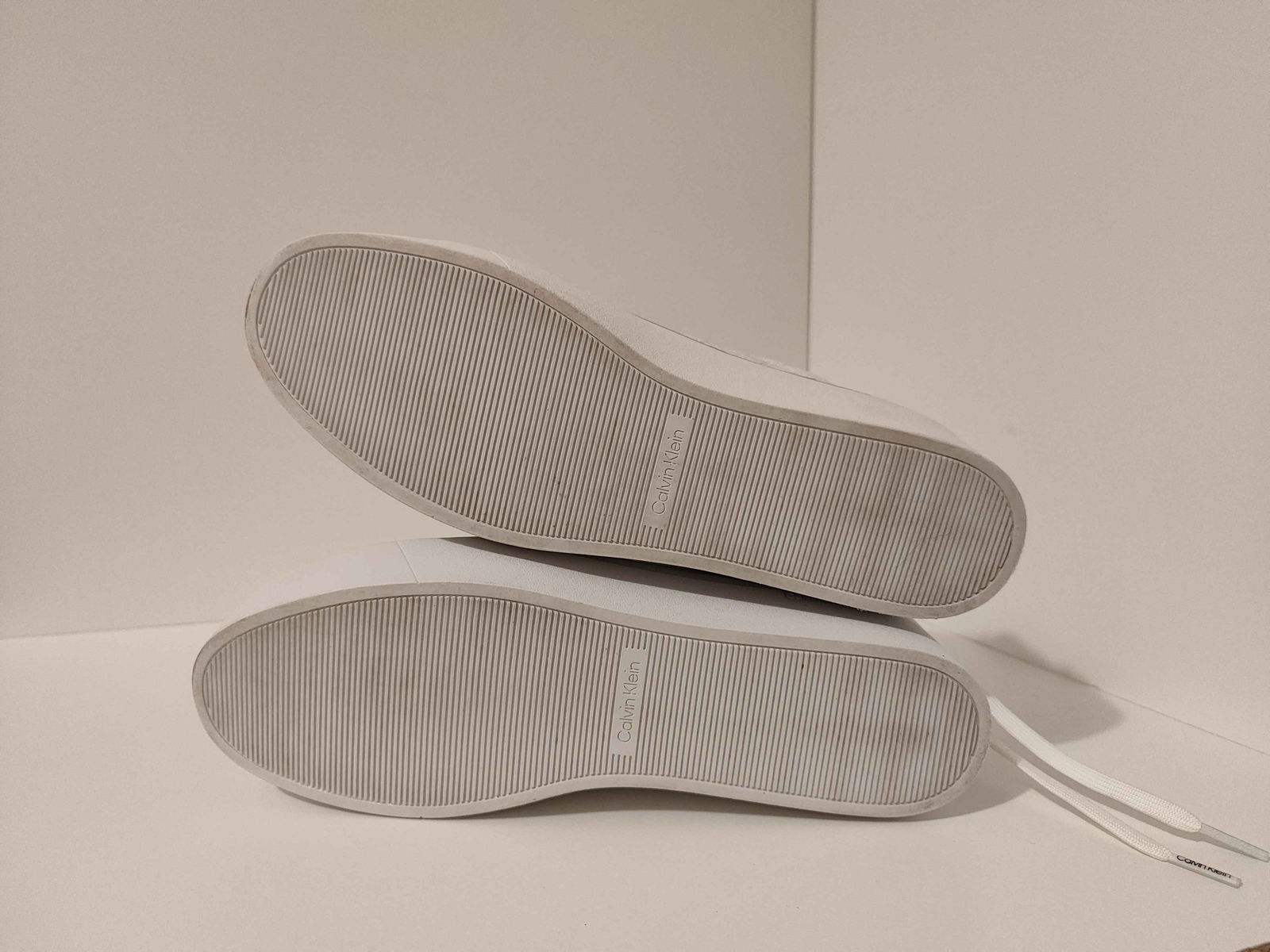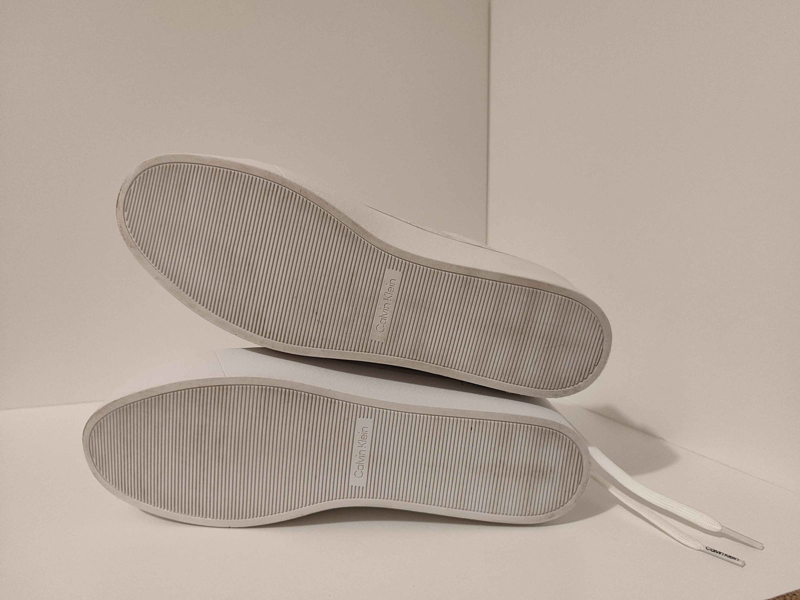 - Podeszwa: Widoczne minimalne ślady użytkowania na spodzie, szczególnie w rowkach bieżnika. Struktura podeszewy ogólnie nienaruszona, z widocznym napisem „Calvin Klein”