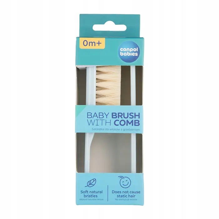 Szczotka do włosów z naturalnego, miękkiego włosia w zestawie z grzebykiem do codziennej pielęgnacji włosów dziecka. Grzebień posiada zaokrąglone ząbki, które nie podrażniają wrażliwej skóry malucha. Szczotka delikatnie masuje główkę dziecka, nie elektryzując włosów. Idealna od pierwszych dni po urodzeniu. Zestaw dostępny w kilku wariantach kolorystycznych.