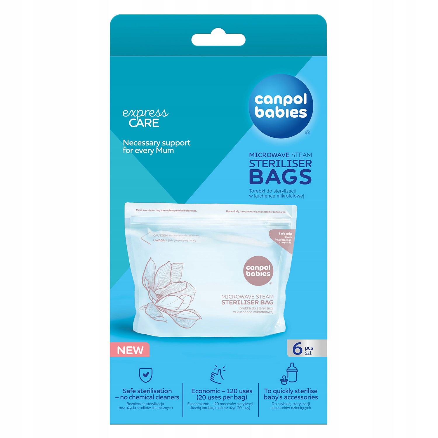 Woreczki do sterylizacji w kuchence mikrofalowej Canpol babies to prosty, szybki i bezpieczny sposób sterylizacji butelek, smoczków, laktatorów oraz innych produktów dla niemowląt i dzieci. Sterylizacja jest bezpieczna, bez użycia środków chemicznych i trwa jedynie 90 sekund. Para wodna, która się wytwarza w torebce podczas procesu sterylizacji, eliminuje bakterie i zarazki, zapewniając produktom higieniczną czystość. Każdą torebkę można użyć aż 20 razy, dzięki czemu jedno opakowanie wystarczy na 120 procesów sterylizacji. Jest to produkt zastępujący tradycyjny sterylizator, gdy jesteś w podróży i nie możesz zabrać ze sobą urządzenia lub nie masz wystarczająco miejsca w domu na dodatkowy sprzęt. Zostały wykonane z bezpiecznego tworzywa, nie zawierającego BPA ani innych szkodliwych substancji.