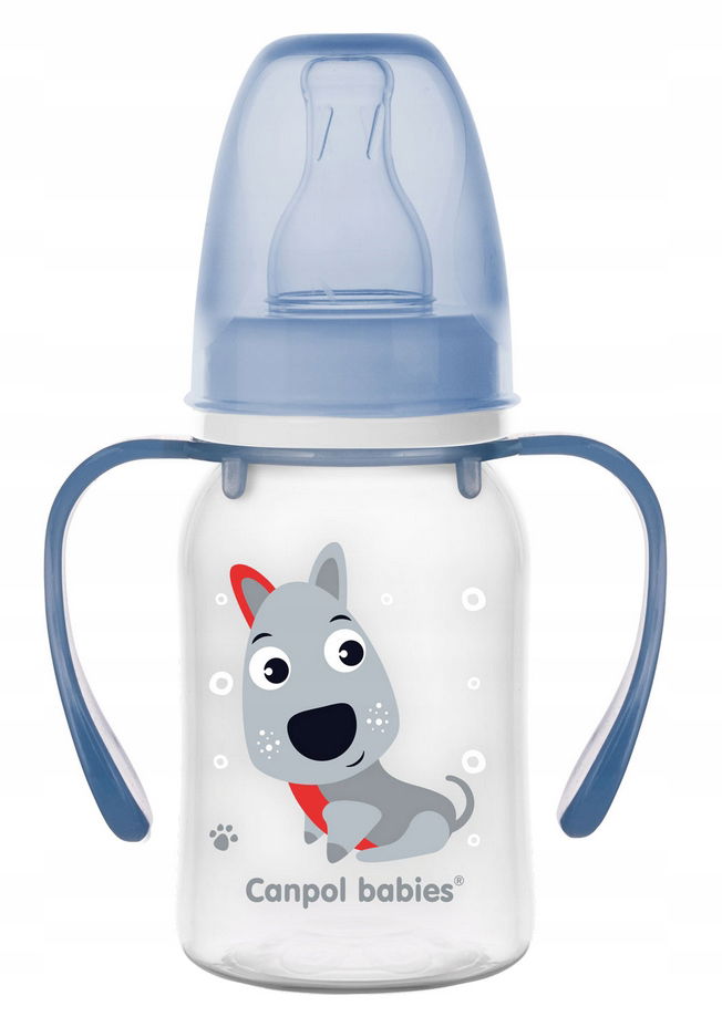 Butelka wąska z uchwytem Canpol babies 120 ml CUTE ANIMALS pozwala na łatwe łączenie karmienia piersią i butelką. Jest kompatybilna ze wszystkimi laktatorami Canpol babies.