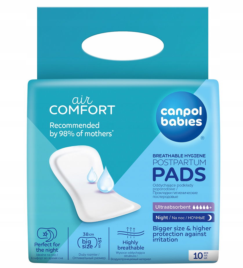 Podkłady poporodowe Canpol babies są niezbędne, zarówno po porodzie fizjologicznym, jak i poprzez cesarskie cięcie ze względu na obfite krwawienia w pierwszych dniach po porodzie oraz potrzebę wietrzenia krocza. Superchłonny wkład szybko wchłania płyny i zatrzymuje wilgoć wewnątrz podkładu.