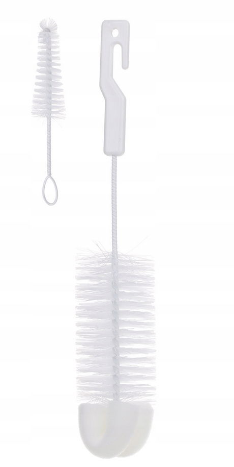 Większa szczotka wyposażona jest dodatkowo w gąbkę, która umożliwia dokładniejsze czyszczenie dna butelki. Mniejsza nadaje się do czyszczenia smoczka z resztek mleka lub kaszki.