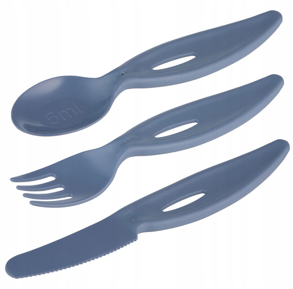 Zestaw zawiera widelec, nóż i łyżkę. Sztućce posiadają szerokie uchwyty, które ułatwiają dziecku trzymanie. Zaokrąglone brzegi sztućców nie podrażniają dziąseł dziecka. Łyżeczka z miarką 5 ml umożliwia odmierzanie i może służyć także do podawania leków.