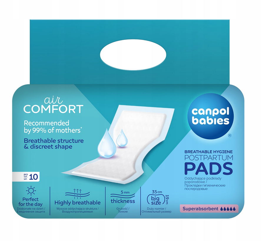 Podkłady poporodowe Canpol babies są niezbędne, zarówno po porodzie fizjologicznym, jak i poprzez cesarskie cięcie ze względu na obfite krwawienia w pierwszych dniach po porodzie oraz potrzebę wietrzenia krocza. Superchłonny wkład szybko wchłania płyny i zatrzymuje wilgoć wewnątrz podkładu.
