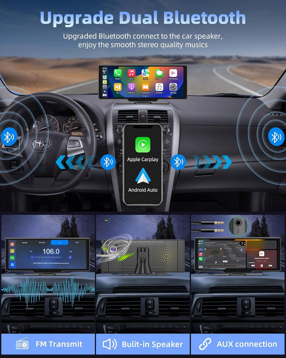 - Podwójna konstrukcja Bluetooth poprawia wrażenia z jazdy Radio samochodowe z najnowszą podwójną technologią Bluetooth umożliwia jednoczesne podłączenie wyświetlacza Apple Carplay i oryginalnych głośników samochodowych przez Bluetooth, dzięki czemu można bezprzewodowo sterować głośnością muzyki, odbierać połączenia i wykonywać połączenia w trybie głośnomówiącym bez zakłóceń podczas jazdy. Możesz także użyć transmisji AUX lub FM do odtwarzania sygnałów audio przez głośniki samochodowe, aby uzyskać jeszcze głośniejszy dźwięk.