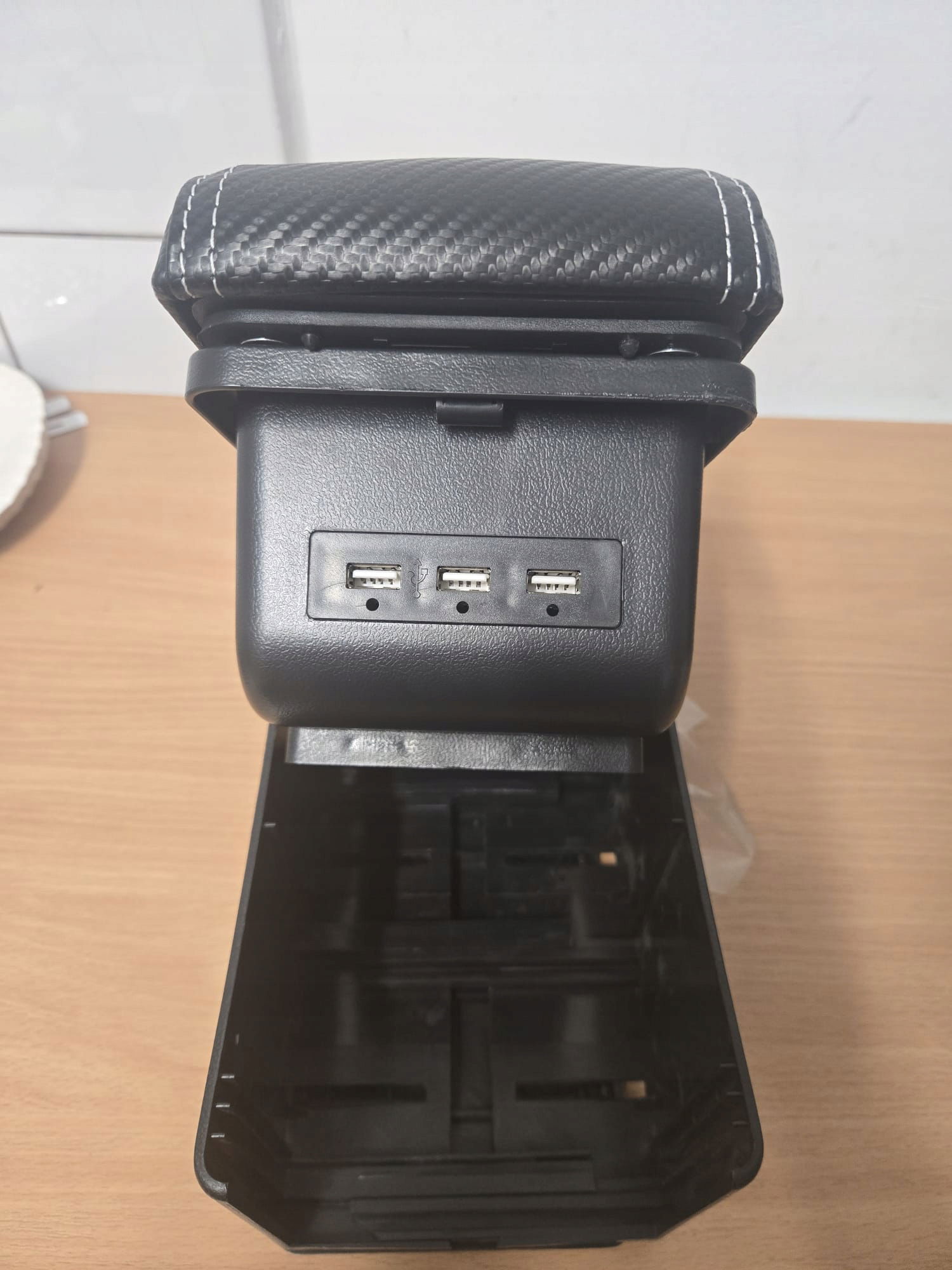 Praktyczny podłokietnik samochodowy z wbudowanym schowkiem i portami USB to wygodne i funkcjonalne rozwiązanie do większości aut. Umożliwia komfortowe oparcie ręki podczas jazdy, a jednocześnie pozwala przechowywać drobne przedmioty w ukrytym schowku. Wykończenie w stylu carbon z ozdobnymi przeszyciami nadaje wnętrzu auta nowoczesny wygląd.