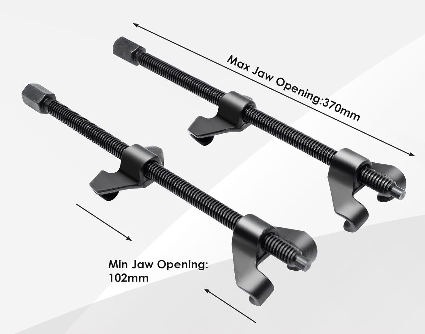 Z rozpiętością do 370 mm, ten zestaw napinaczy jest uniwersalny i pasuje do większości sprężyn samochodowych, co czyni go wszechstronnym narzędziem do pracy z amortyzatorami teleskopowymi w różnych modelach pojazdów.