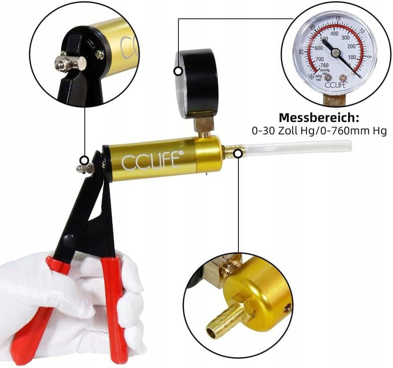 Wskaźnik pompy próżniowej jest fabrycznie skalibrowany i mierzy zarówno w calach, jak i milimetrach (zakres pomiarowy: 0-30 cali Hg, 0-760 mm Hg).