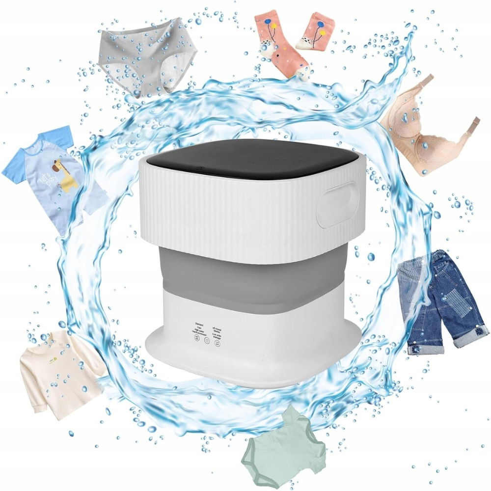 Pralka ma składaną obudowę, co ułatwia jej przechowywanie i transport. Idealna do użytku w domach, akademikach, na kempingach czy podczas podróży.