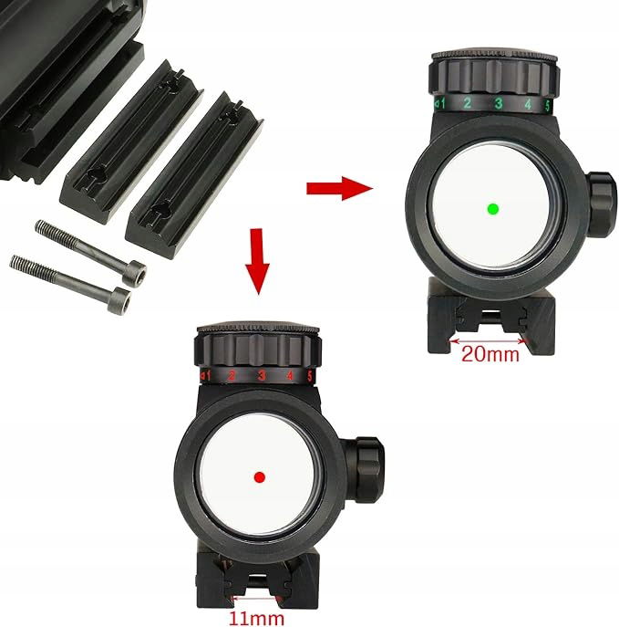 ? Ciekawe funkcje: Oferuje możliwość wyboru między czerwonym a zielonym punktem celowniczym, dostosowując się do różnych warunków oświetleniowych z 5 ustawieniami jasności!