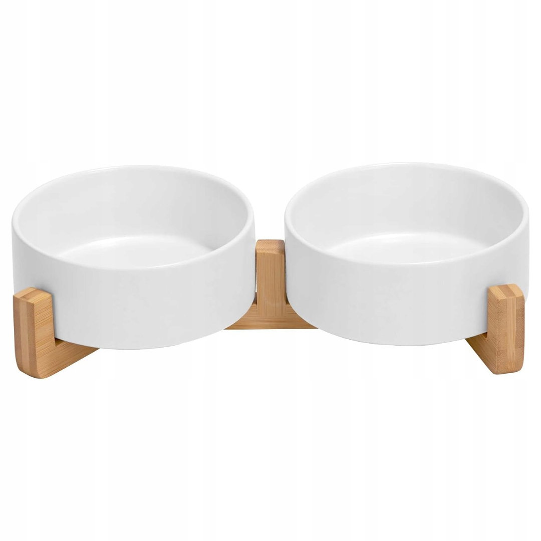 Ceramiczna miska dla psa podwójna na karmę stojak drewniany 400 ml BIAŁE
