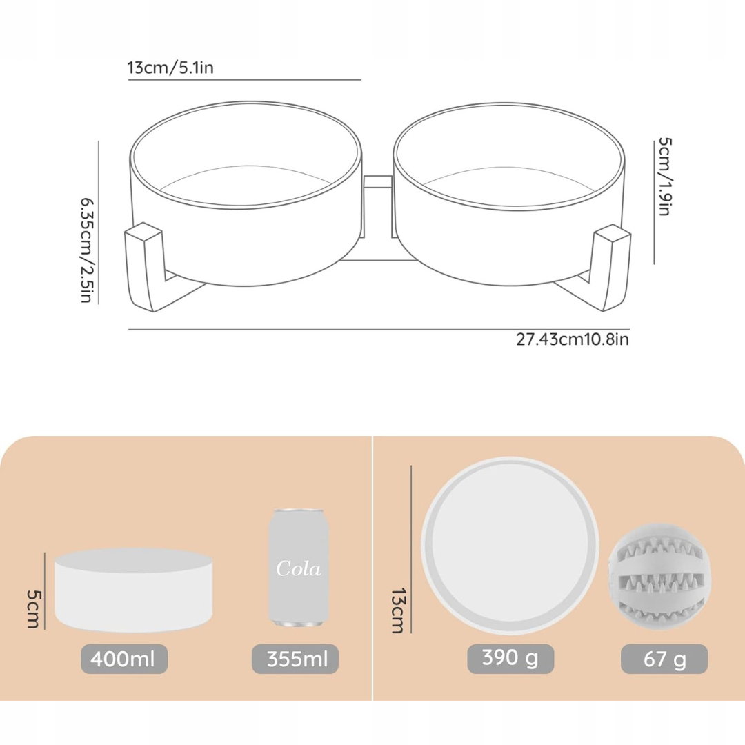 - Podwójna konstrukcja misek: zestaw obejmuje jedną miskę na karmę i jedną na wodę, każda ceramiczna miska wyposażona w bambusową podstawę, która zapewnia wygodniejsze i bardziej komfortowe karmienie.