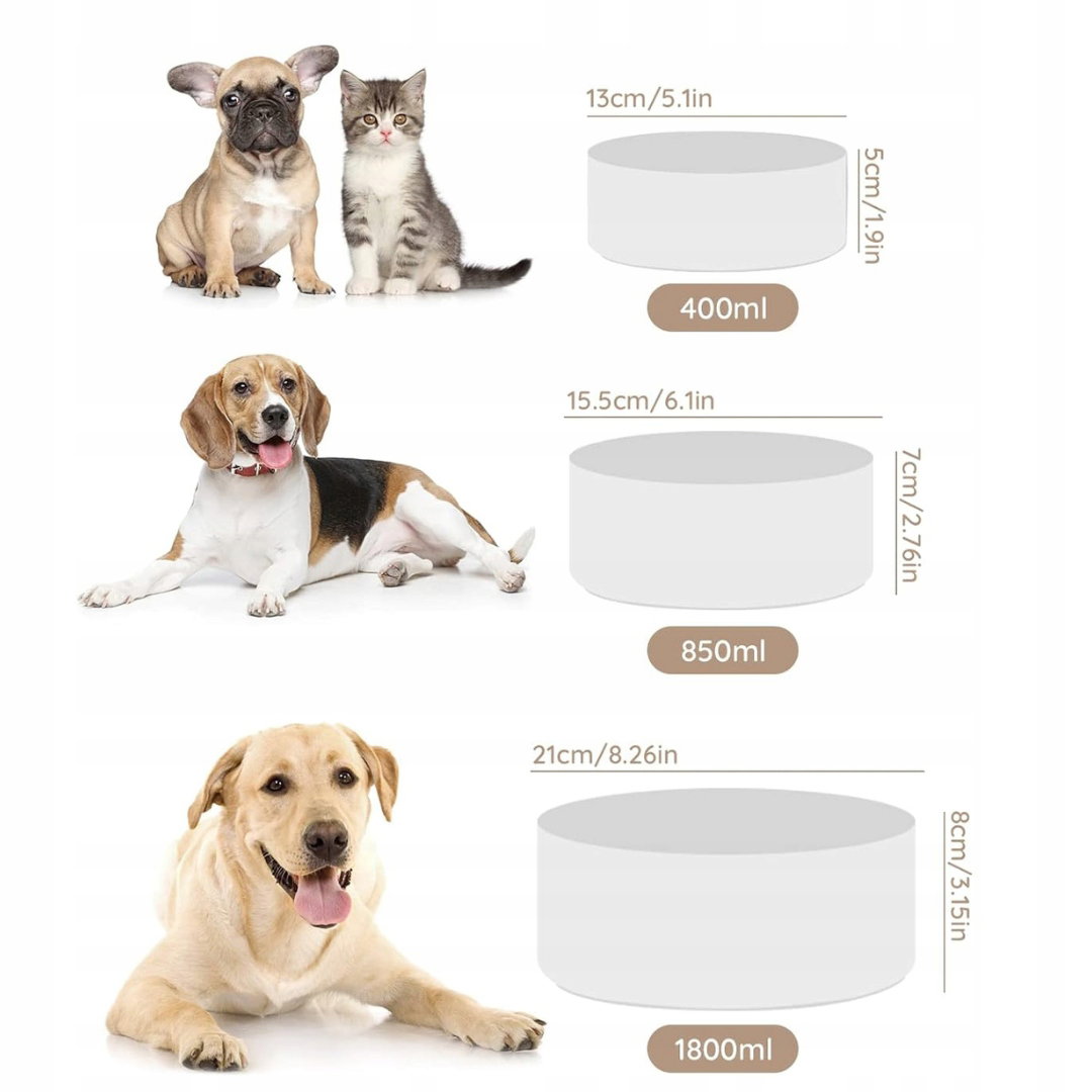 - Pojemność: każda miska o pojemności 400 ml, odpowiednia dla kotów i psów różnych ras wymagających kontroli diety ze względu na wagę.