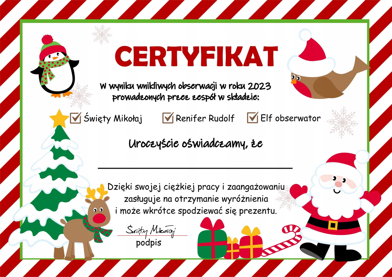 Starannie wykonany certyfikat na pewno zapadnie w pamięć, dzięki czemu będzie wyróżniał się na Mikołaju w przedszkolu.