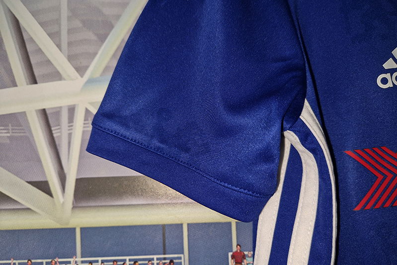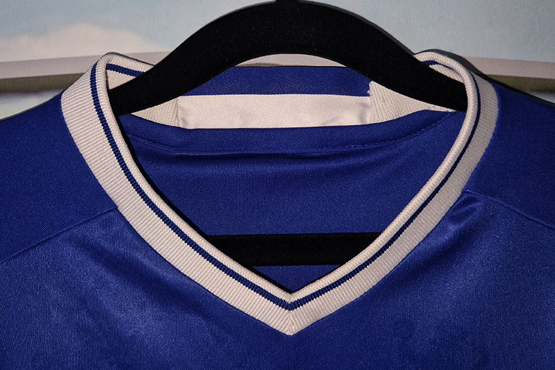 Koszulka posiada krótkie rękawki i dominuje w niej kolor niebieski wraz z biało - czerwono – złotymi „dodatkami” zaś kołnierzyk tego piłkarskiego trykotu jest wykonany w stójkę.