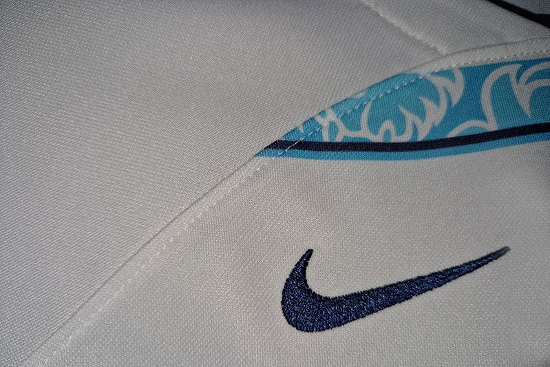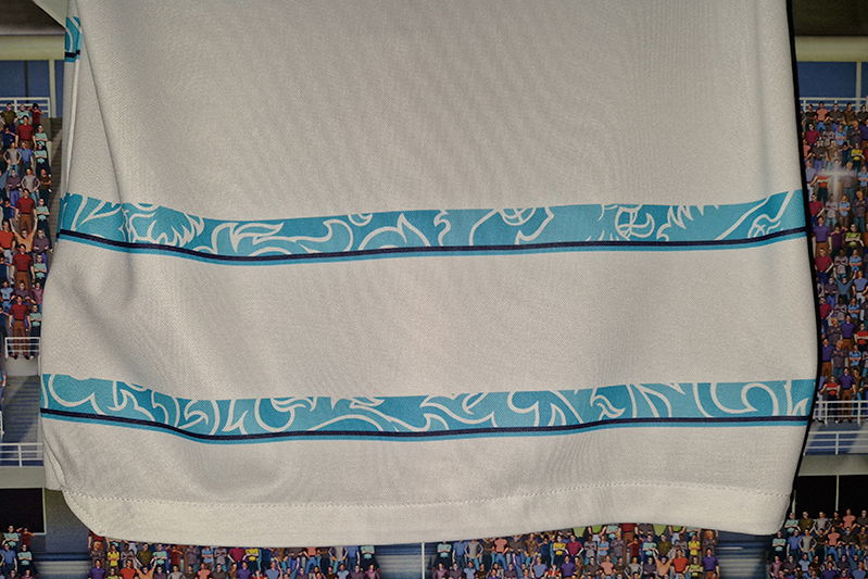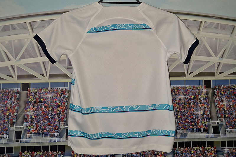 Koszulka posiada krótkie rękawki i dominuje w niej kolor biały wraz z granatowo – błękitno - czarnymi „dodatkami” zaś kołnierzyk tego piłkarskiego trykotu jest okrągły wykonany w stójkę.