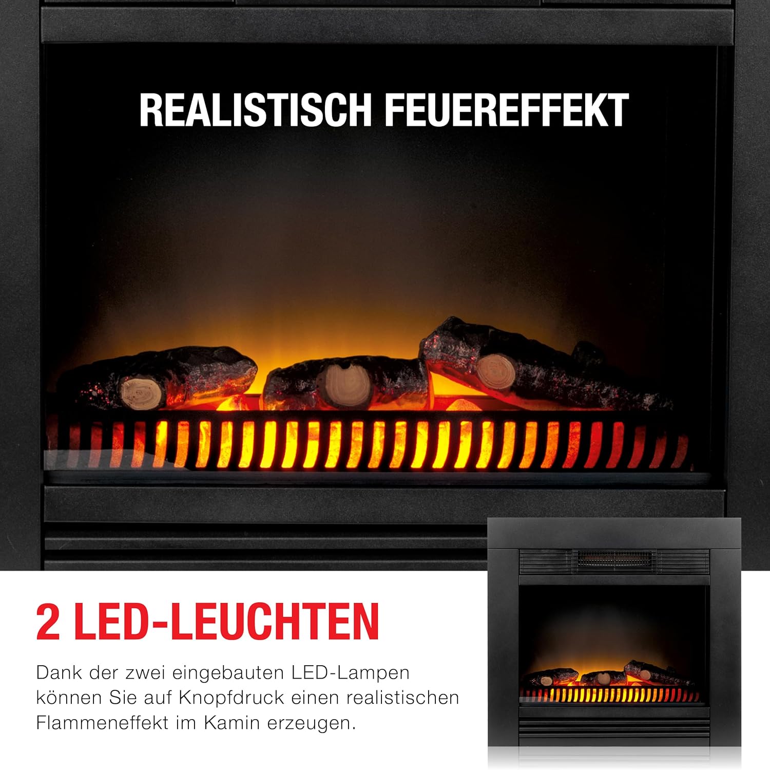 - Efekt prawdziwego ognia: dzięki technologii LED oraz sztucznym polanom, płomień wygląda jak naturalny, tworząc ciepły, przytulny klimat.