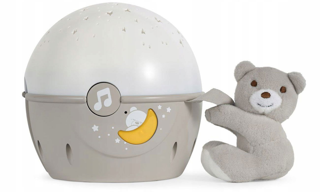 Projektor Gwiazdek - tuż obok łóżeczka, na nocnej szafce Projektor Gwiazdek z serii First Dreams zapewni maluszkowi słodki i spokojny sen, już od pierwszych dni jego życia. Projektor kreuje magiczną atmosferę towarzyszącą usypianiu. Odtwarza muzykę klasyczną (m.in. Bach i Rossini) i New Age oraz kojące dźwięki natury (łącznie 6 minut zmieniających się automatycznie efektów dźwiękowych), wyświetlając przy tym w pokoju dziecka gwiaździste wielobarwne projekcje. Po naciśnięciu niewielkiego, złotego księżyca obok przycisku dźwiękowego, działa również jak lampka nocna, emitując światełko z subtelnym natężeniem, idealnym do pomieszczeń w nocy. Do projektora dołączona jest maskotka, którą można odczepić i która może towarzyszyć dziecku podczas snu. Projektor ma płaską podstawę, dzięki czemu można go ustawić w niewielkiej odległości od dziecka, na stoliku czy szafce nocnej. Zabawka dostępna jest w wersji różowej i błękitnej, w charakterystycznym dla serii First Dreams prezentowym opakowaniu. Sugerując, że jest to fantastyczny prezent na powitanie nowego członka rodziny. Wymiary opakowania: 26 x 21 x 16 cm. Wiek: 0m+.