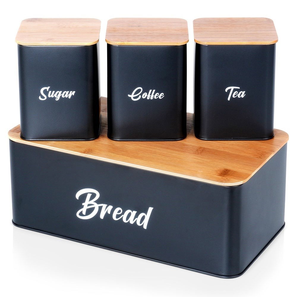 Wykonane z metalu i drewna bambusowego - Chlebak oraz pojemniki wykonane z wysokiej jakości metalu malowanego proszkowo na czarny, matowy kolor. Chlebak posiada deskę wykonaną z drewna bambusowego a pojemniki bambusowe pokrywki. Metalowa konstrukcja skutecznie chroni pieczywo przed zgnieceniem i uszkodzeniami.