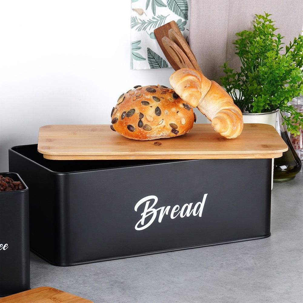 Chlebak Czarny Metalowy Bambusowy Pojemnik Kuchenny na Pieczywo Chleb