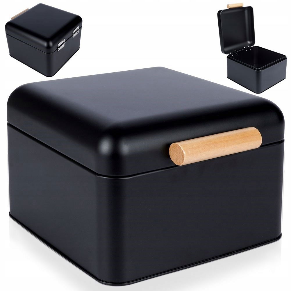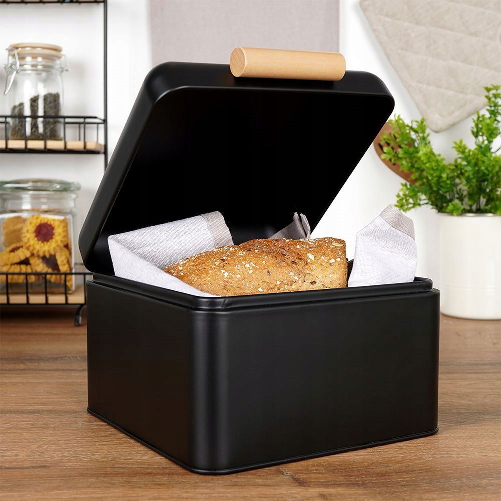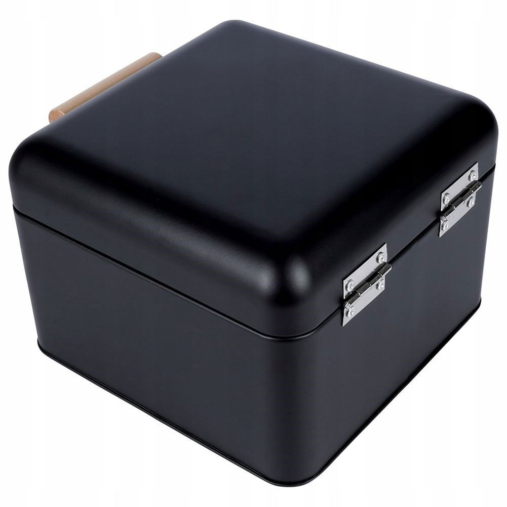 METALOWY - Chlebak wykonany z wysokiej jakości metalu w czarnym kolorze. Chlebak ma wymiary zewnętrzne: 22 x 20 x 14 cm. ZAMYKANY - Chlebak posiada zamknięcie w formie pokrywy otwieranej za pomocą uchwytu wykonanego z drewna lotosu. Pokrywa przymocowana jest na dwóch zawiasach, co zapewni wygodne otwieranie i zamykanie chlebaka. PRZYDATNY - Chlebak pozwoli nam na odpowiednie przechowywanie pieczywa, jak również zachowa jego świeżość. MODNY DESIGN - Pojemnik niezwykle elegancko prezentuje się w każdym wnętrzu, będzie stanowił wyjątkową ozdobę kuchni. Utrzymany w modnej kolorystyce. KOMPAKTOWY - Chlebak nie zajmuje dużo miejsca. Idealny nawet do małych kuchni. Pomieści mały chleb, kilka bułek lub inne pieczywo. Kompaktowy chlebak utrzymany w modnym stylu. Posiada wygodne zamknięcie. Niezwykle efektownie prezentuje się w kuchni. Dzięki mniejszym rozmiarom będzie idealny do przechowywania mniejszej ilości pieczywa. Prosty klasyczny wzór sprawi, że pasuje do każdego wnętrza. Chlebak będzie stanowił wyjątkowy element dekoracyjny w każdej kuchni. Wyprodukowano zgodnie z europejskimi standardami.